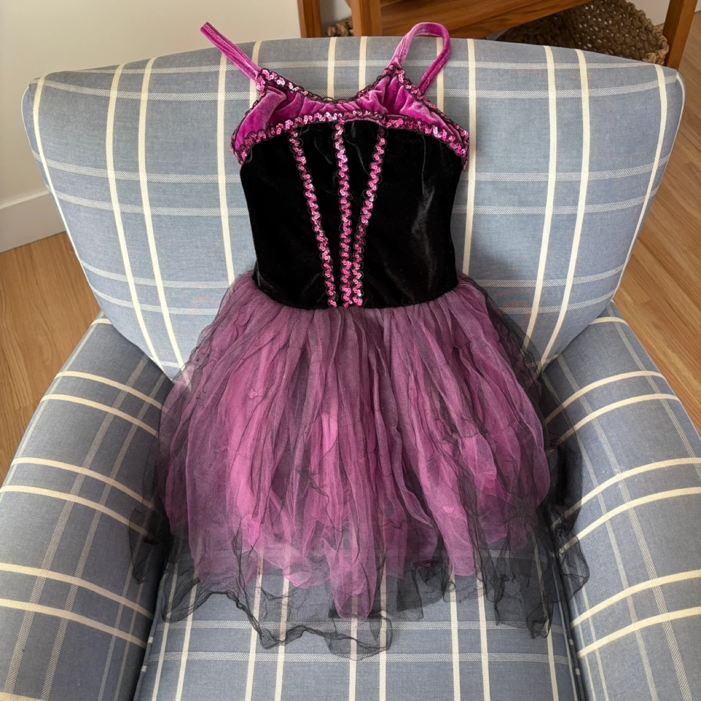 A beautiful black and purple ballet leotard dress for girls! It features a velvet bodice, sequin detailing, and a layered tulle skirt. Perfect for dance class or dress-up!