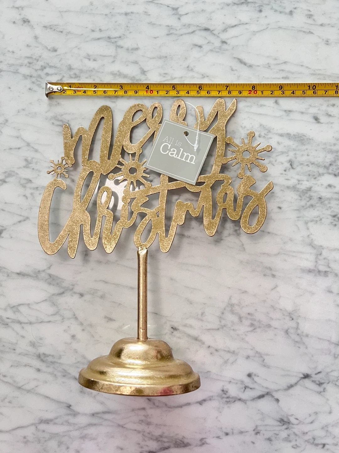 Add a touch of holiday cheer to your home with this Merry Christmas tabletop decor! It features a gold finish and stands approximately 9 inches tall. Perfect for adding a festive touch to any room during the holiday season