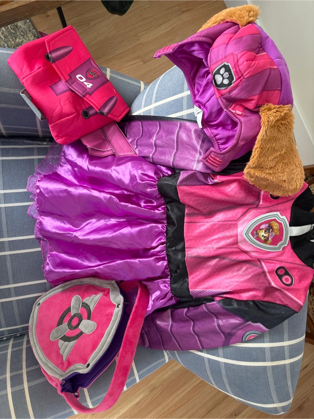 Paw Patrol Skye dress up costume for sale! Includes the dress, hat, backpack and bag. Perfect for any little Paw Patrol fan!