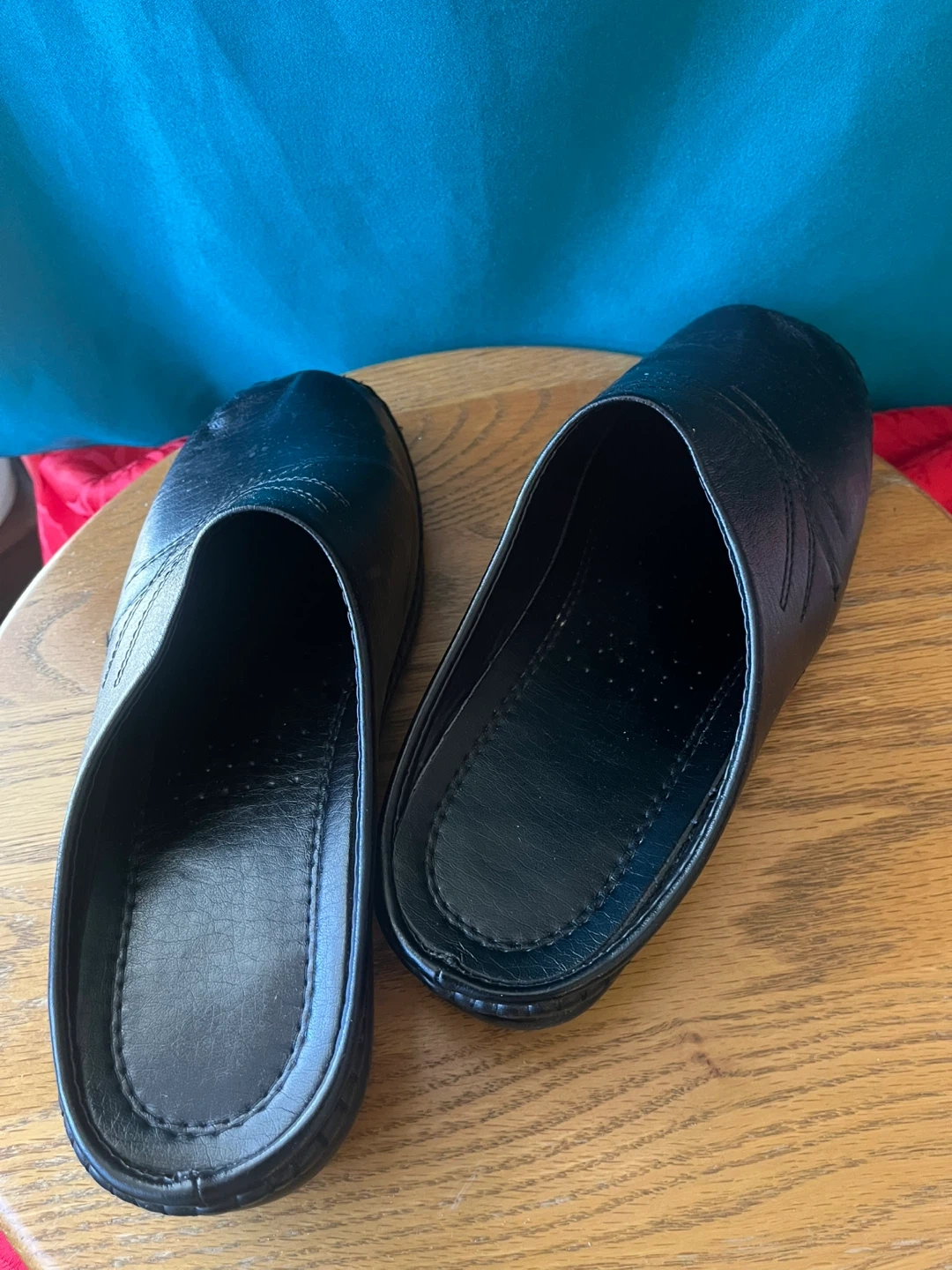 This is a pair of black leather mules (or slippers) in size 38, which translates to Canadian size 7.5-8. They are in good condition and would be perfect for wearing around the house or for a quick trip outside. The soles have a good grip, and the leather is soft and comfortable.