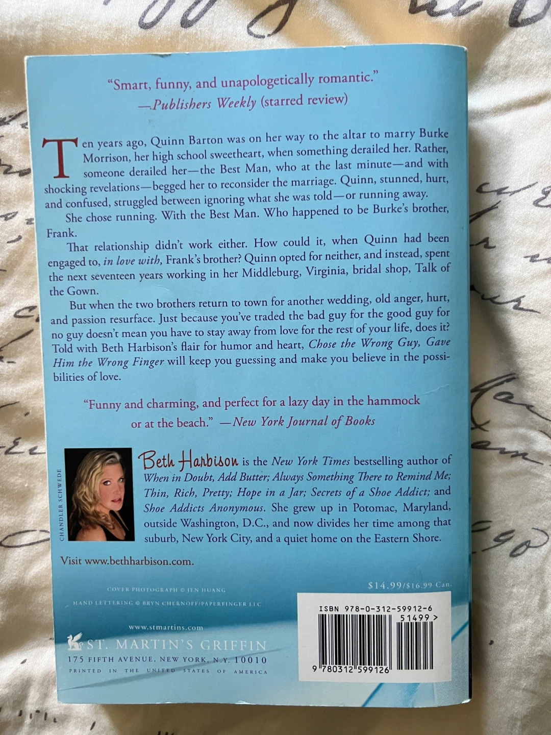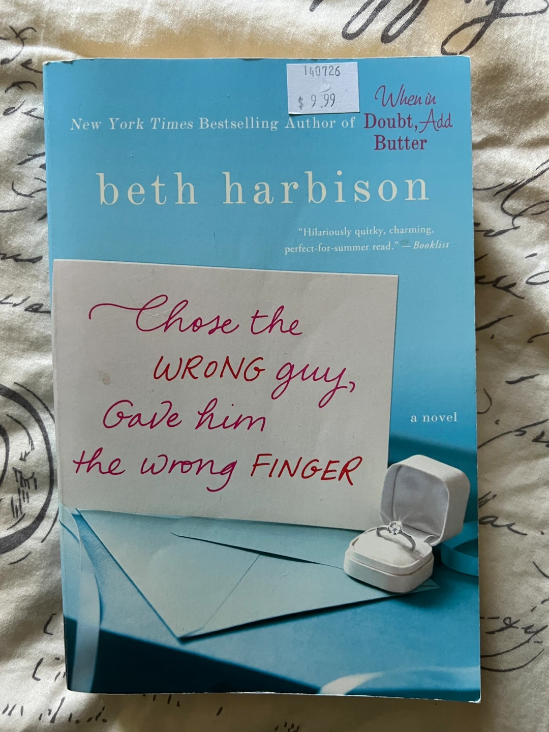 Selling the novel 'Chose the Wrong Guy, Gave Him the Wrong Finger' by Beth Harbison. It's a New York Times Bestselling Author book. The cover price was originally $14.99. Perfect for a light and charming read!