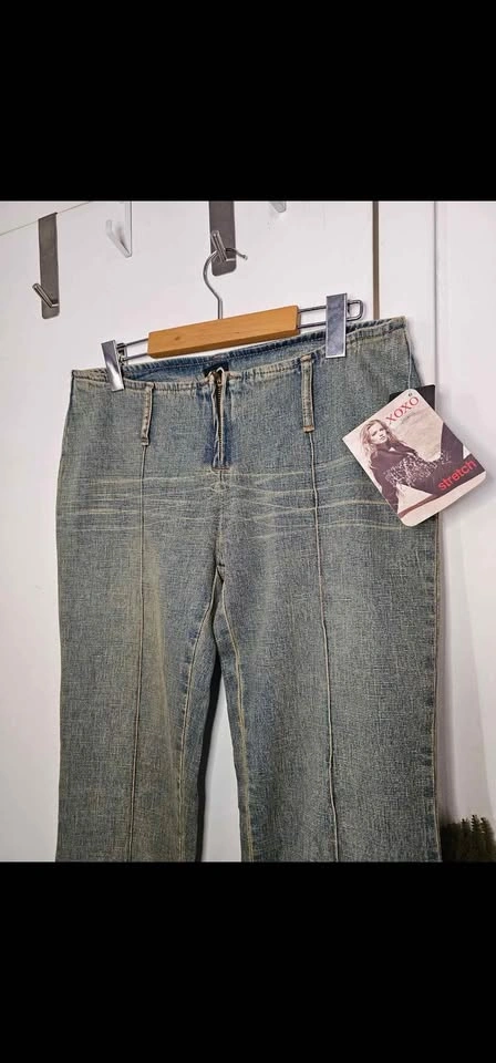Vintage Y2K deadstock low rise flare/ bootcut Hipster jeans in a faded light blue wash with beige tones, brand new with tag and straight out of the early 2000s! These XOXO jeans feature a zipper fly, and have no pockets for a fitted look with no extra bulk. They have wide beltloops for a chunky belt, and front seam accents. They are stretchy and made of a blend of cotton, polyester and spandex. Accent stitching is a light brown/ mustard yellow color.