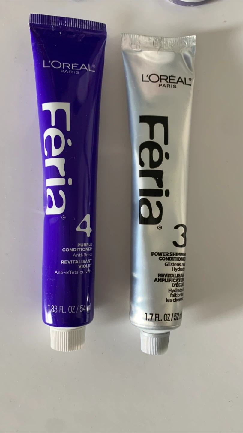 1000+Giving away two tubes of L'Oréal Féria hair conditioner! One is a purple anti-brass conditioner, and the other is a power shimmer conditioner. The purple tube contains 1.83 fl oz / 54 ml, and the silver tube contains 1.7 fl oz / 52 ml