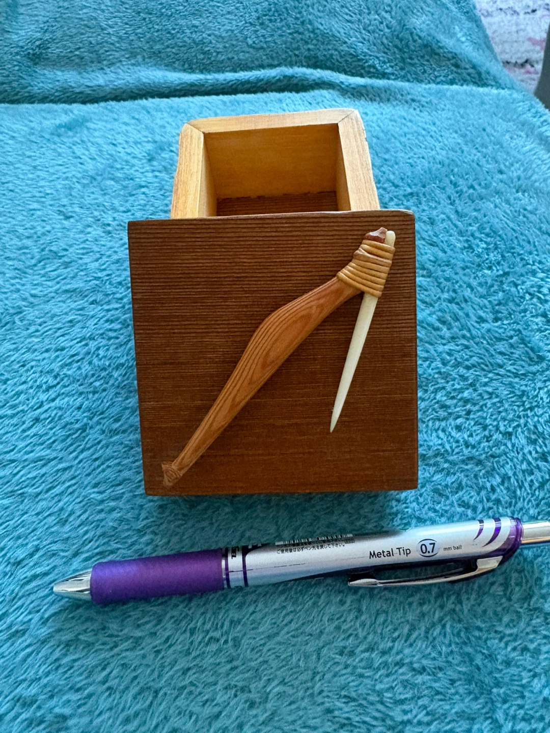 Selling a cute little wooden box with a unique carved detail on the front. It's in great shape and would be perfect for storing small items or as a decorative piece.