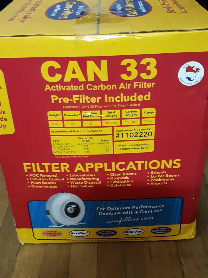 37This Can 33 Carbon Filter is brand new in the box! A Carbon Filter is a must have for hydroponic indoor growers! Technical Data: Max Exhaust CFM: 200 cfm / 350 m³h @ 0.1 sec contact time Max Recirculating (Scrubbing) CFM: 400cfm / 700 m³h Recommended Min Airflow: 100 cfm / 175 m³h Prefilter: Yes Flange: 4" - 6" Dimensions: (with prefilter) Outside Diameter: 30.5 cm/ 12" Height: 33 cm / 13" Total Weight: 11.5 kg / 25.3 lbs. Carbon Weight: 7.5 kg / 16.5 lbs. Carbon Bed Depth: 5 cm / 2" Max Operating Temp: 80˚C Pressure drop at max CFM: 180pa / .75"wg