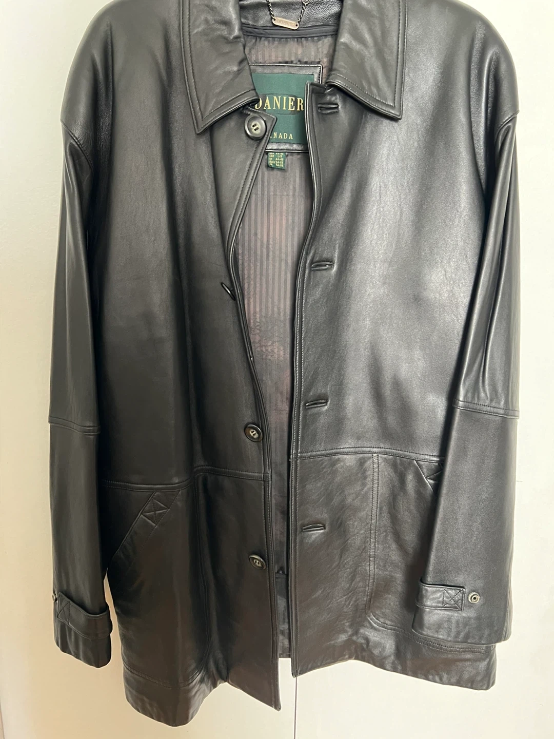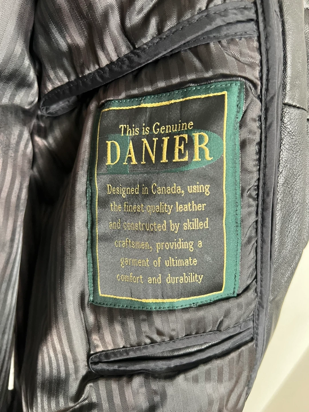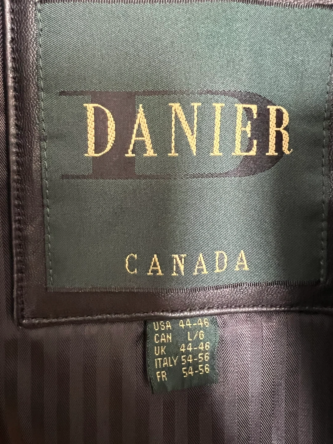 This is a genuine Danier leather jacket, designed in Canada. It's a size L/6. The jacket is constructed of quality leather, providing comfort and durability. Comes with a Danier garment bag