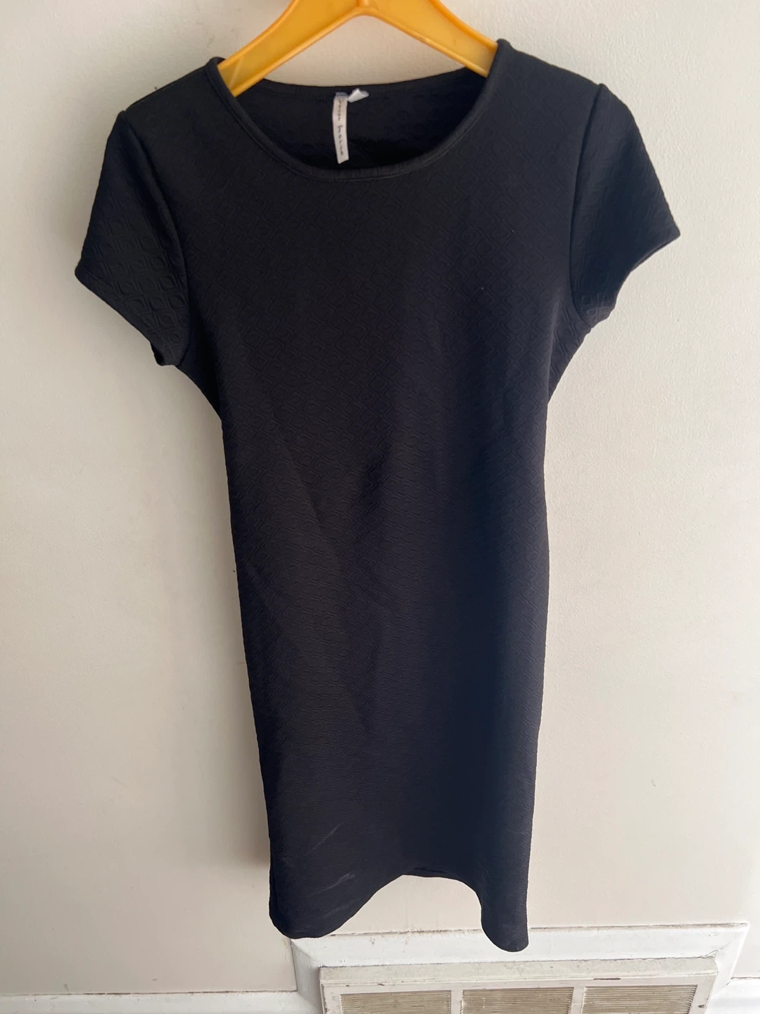 71A cute black dress with short sleeves! It has a nice texture and a small cutout in the back. Perfect for a casual day out or dressed up for an evening event
