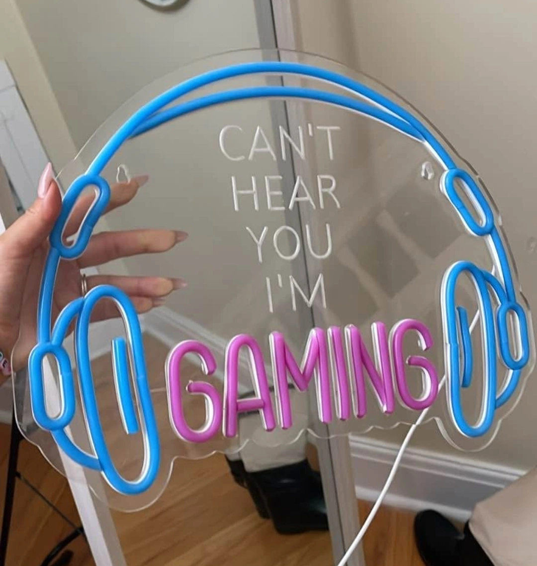 Selling a fun neon sign that says "Can't Hear You I'm Gaming"! It's shaped like a headset and has a cool blue and pink colour scheme. Perfect for a gamer's room or setup