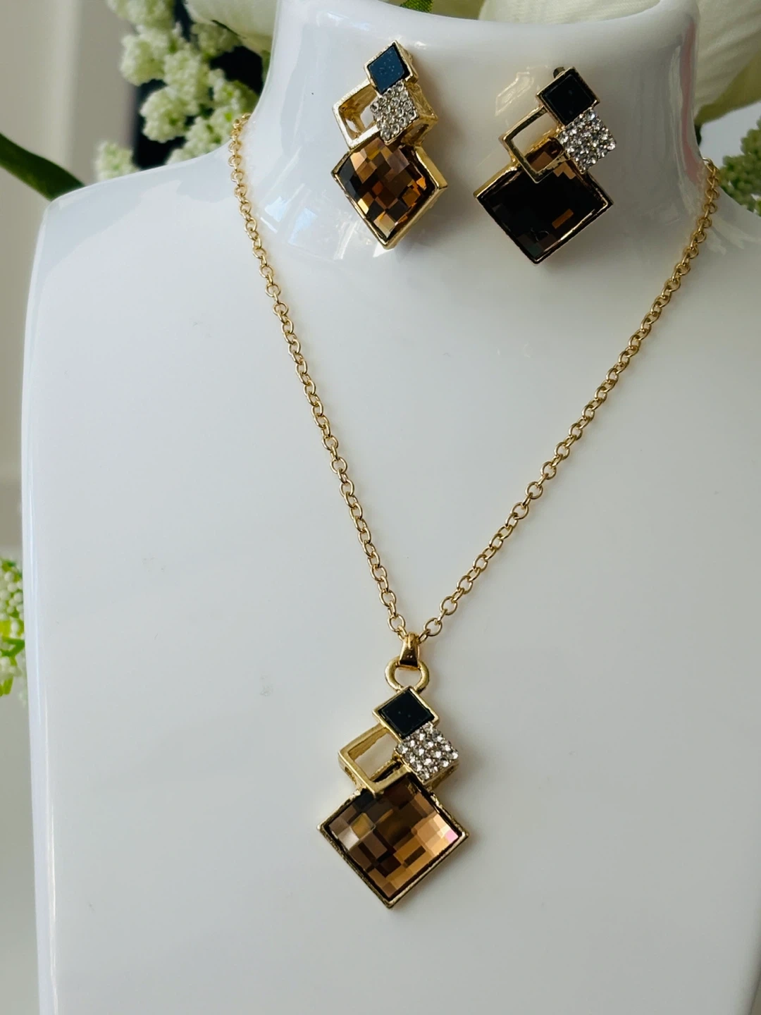 244Selling a lovely necklace and earring set! The set features a gold chain and geometric pendant with brown and black accents, plus some sparkly rhinestones. The matching earrings have the same design.