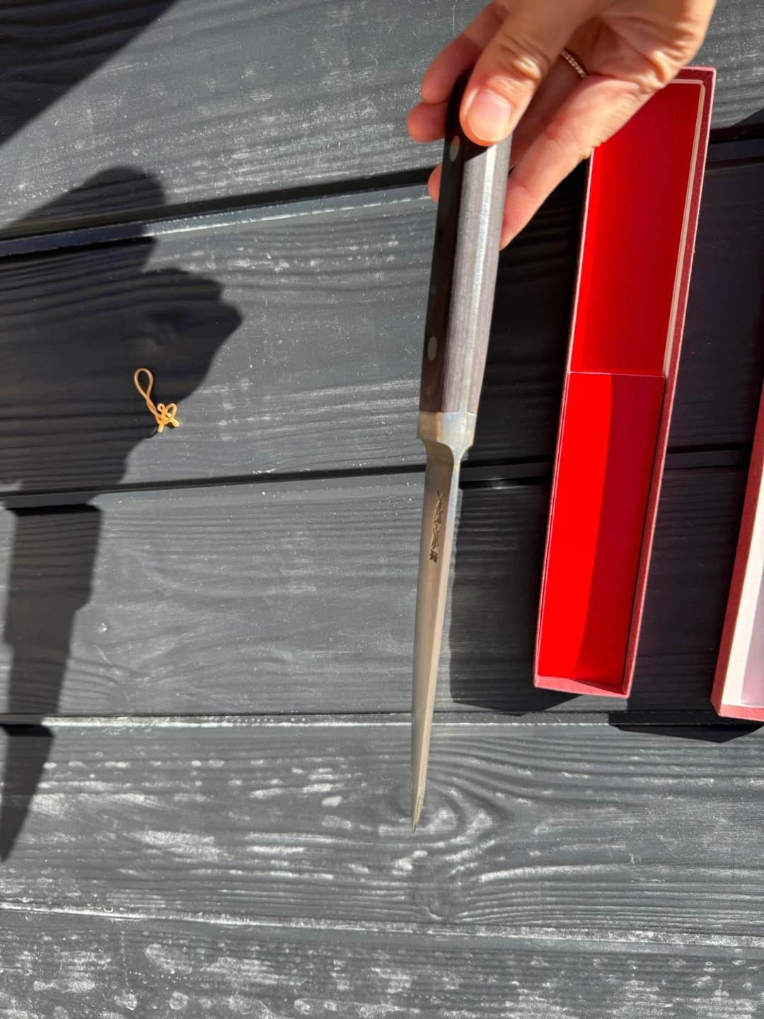 Selling a Japanese kitchen knife that comes with its original box. It's in great condition and ready for a new home. Perfect for any home chef!