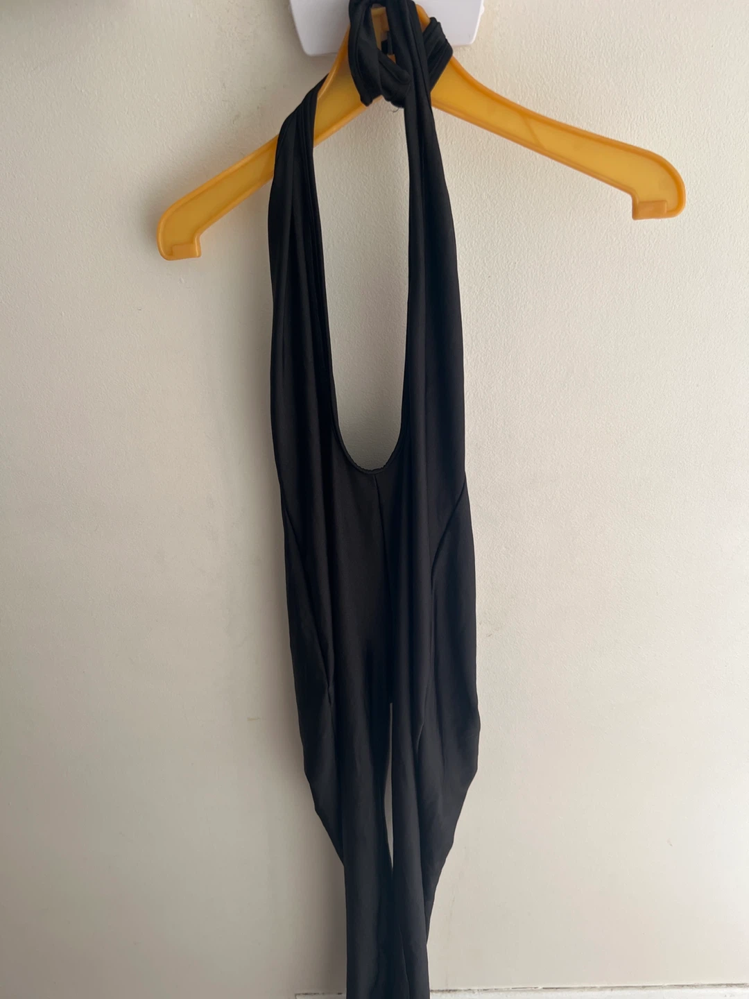 Selling a stylish black halter neck jumpsuit. It's in great condition and ready for a new home! The material is soft and comfortable, perfect for a night out or a special occasion