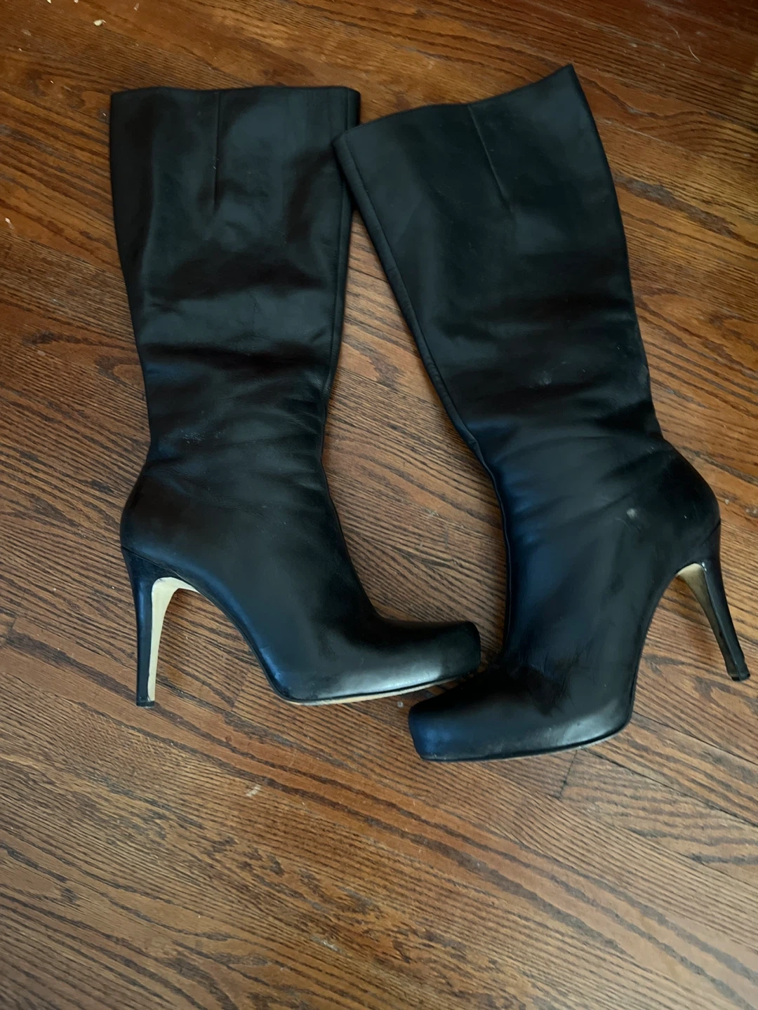 Selling a pair of black leather knee-high heel boots! They are in good condition and would be a great addition to your wardrobe. Perfect for dressing up an outfit or adding a bit of edge