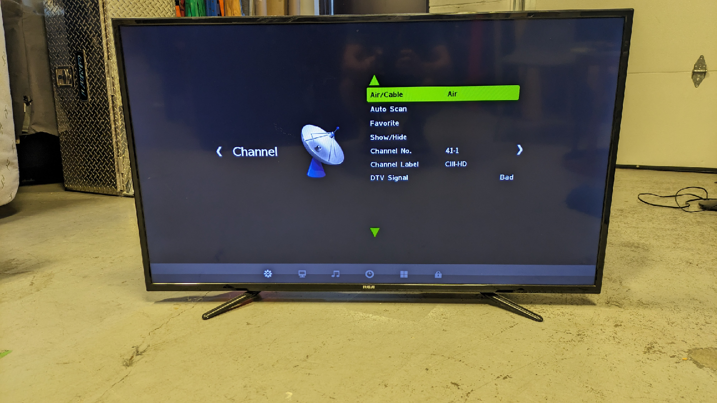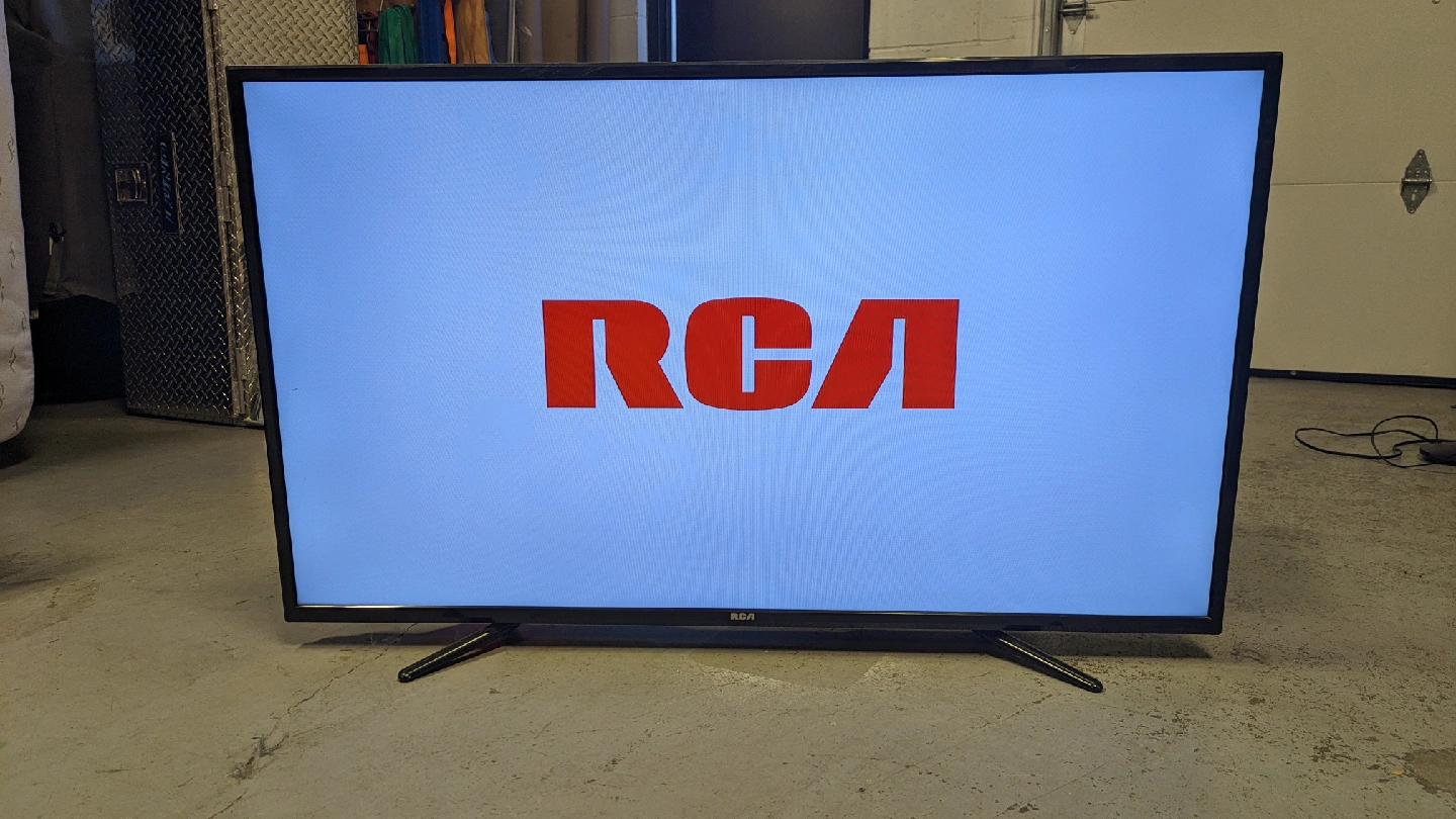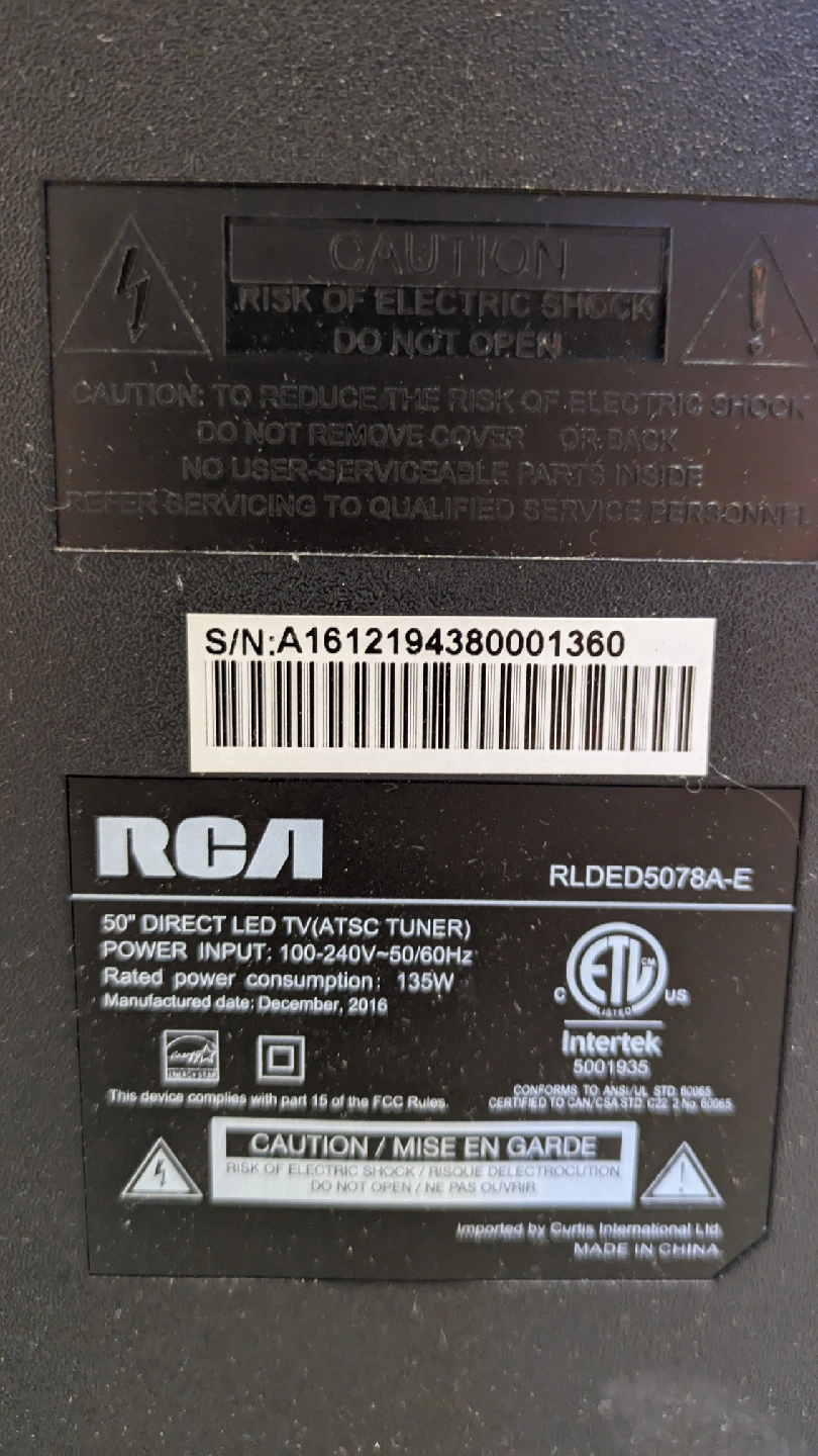 Selling a 50" RCA Direct LED TV (ATSC Tuner). The model number is RLDED5078A-E. It has multiple HDMI ports, VGA, and RF inputs. Power input is 100-240V~50/60Hz, with a rated power consumption of 135W. Manufactured December, 2016