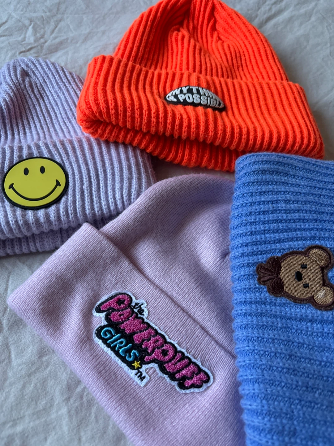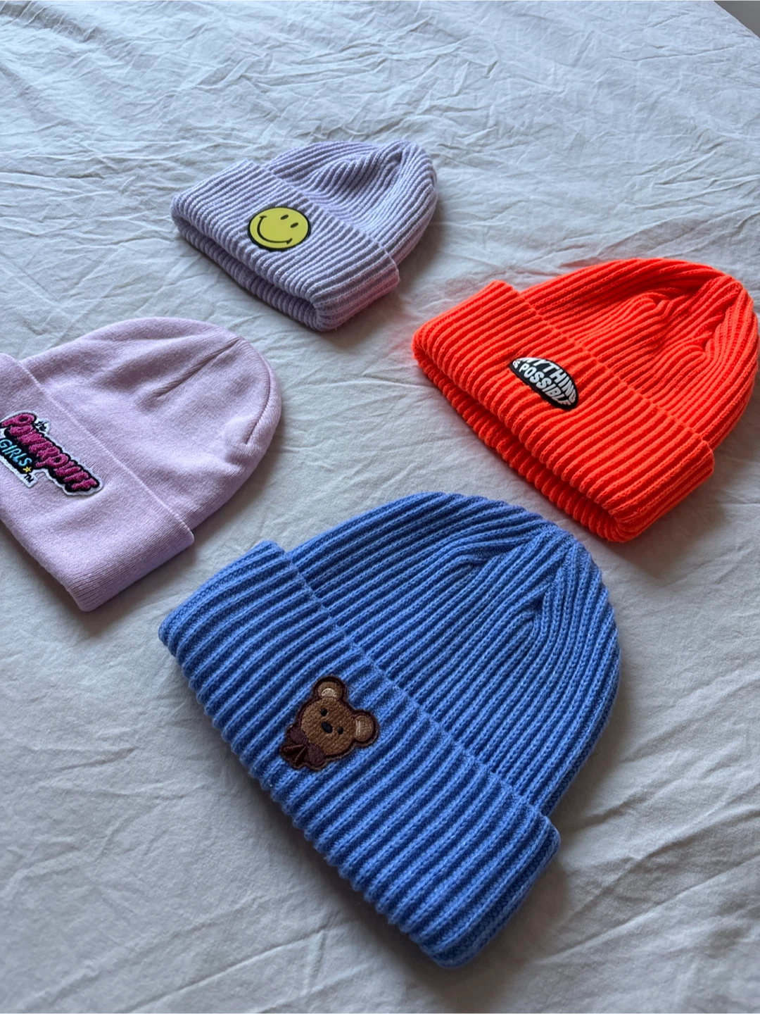 Selling a collection of cute beanies! There's a light purple one with a smiley face, a light pink one with a Powerpuff Girls logo, an orange one with a "Anything Possible" patch, and a blue one with a teddy bear. They're all in great condition and ready to keep you warm!