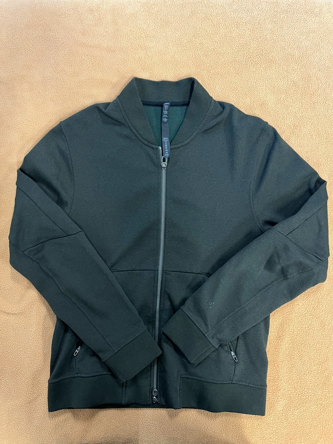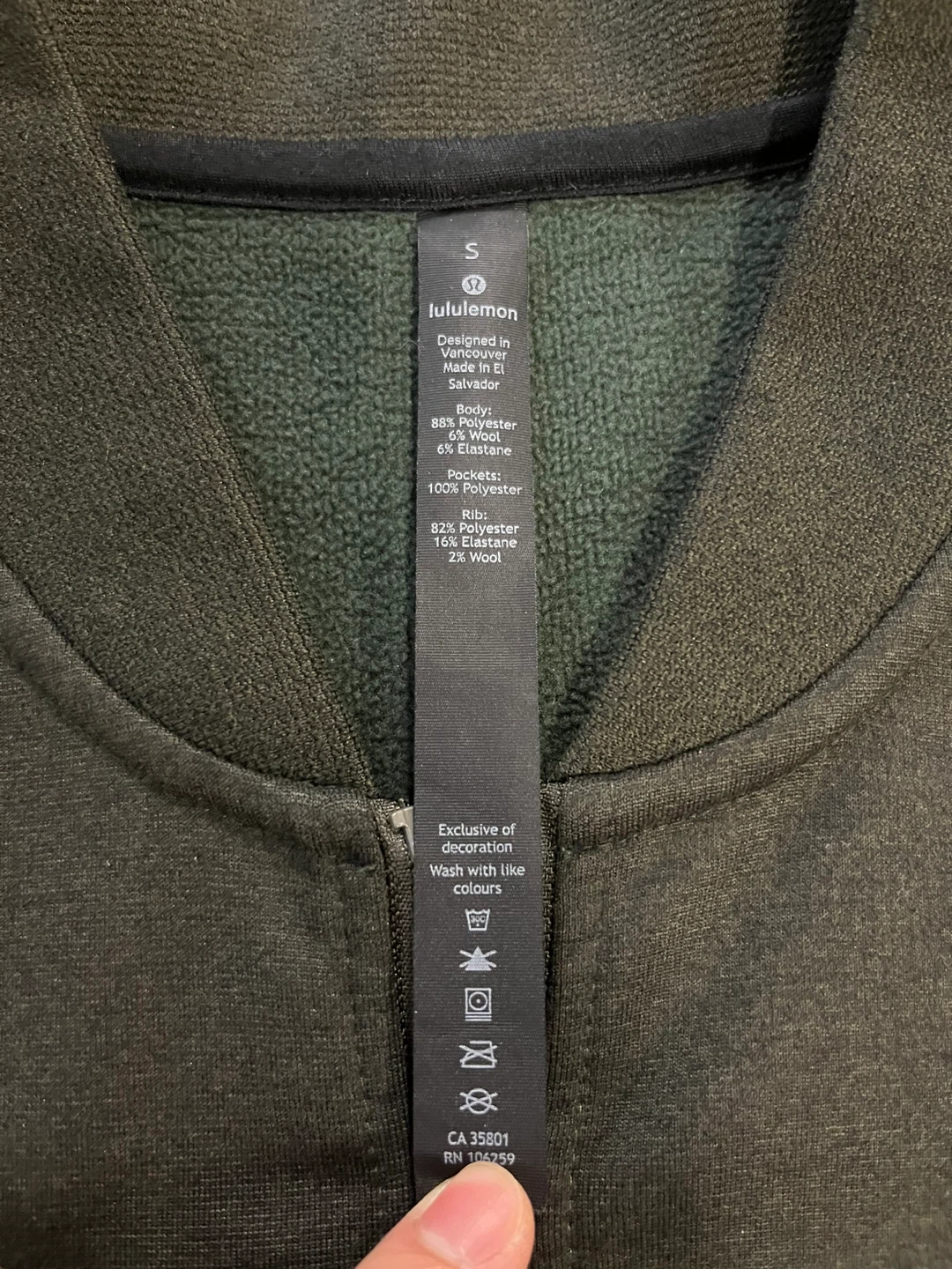 15This Lululemon bomber jacket is in great condition and ready for a new home! It's a size small and has a sleek, modern look. The body is made of 88% polyester and 6% wool and 6% elastane, while the pocket is 100% polyester. The ribbing is 82% polyester, 16% elastane, and 2% wool