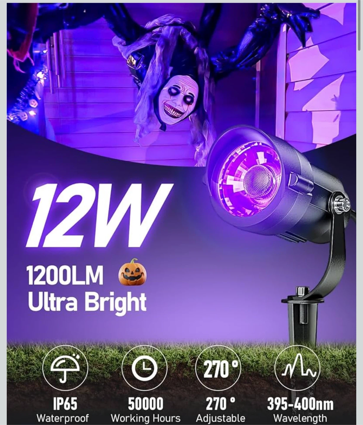 Get ready to command the darkness with this 12W black light! Perfect for Halloween decorations. It shines brighter and scares better. It is waterproof with IP65 rating and has a 270° adjustable angle. It also features efficient heat dissipation and a durable metal material.