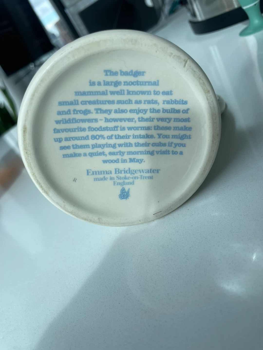 Selling an Emma Bridgewater mug featuring a badger design! It's a charming piece made in Stoke-on-Trent, England. The mug has a lovely cream color and is in great condition. It would be perfect for adding a touch of whimsy to your kitchen or as a gift for a badger lover