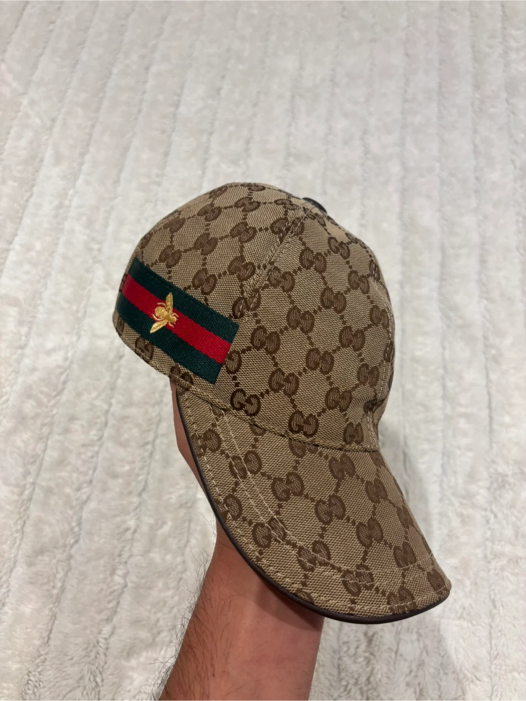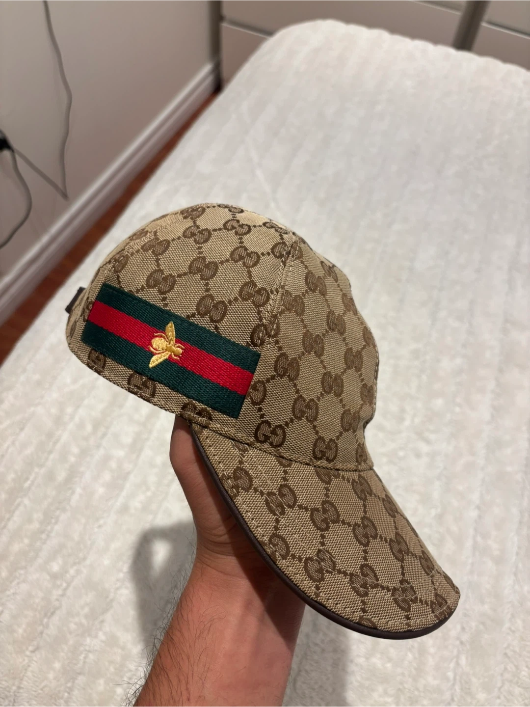 Selling a Gucci baseball hat in size M. It features the classic GG canvas pattern and the iconic bee embroidery. The hat is in great condition