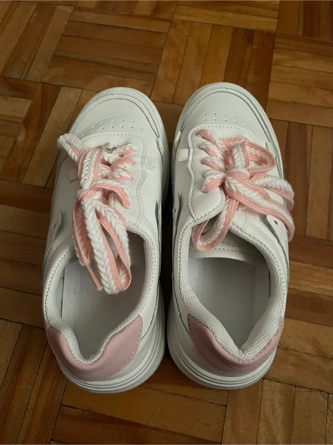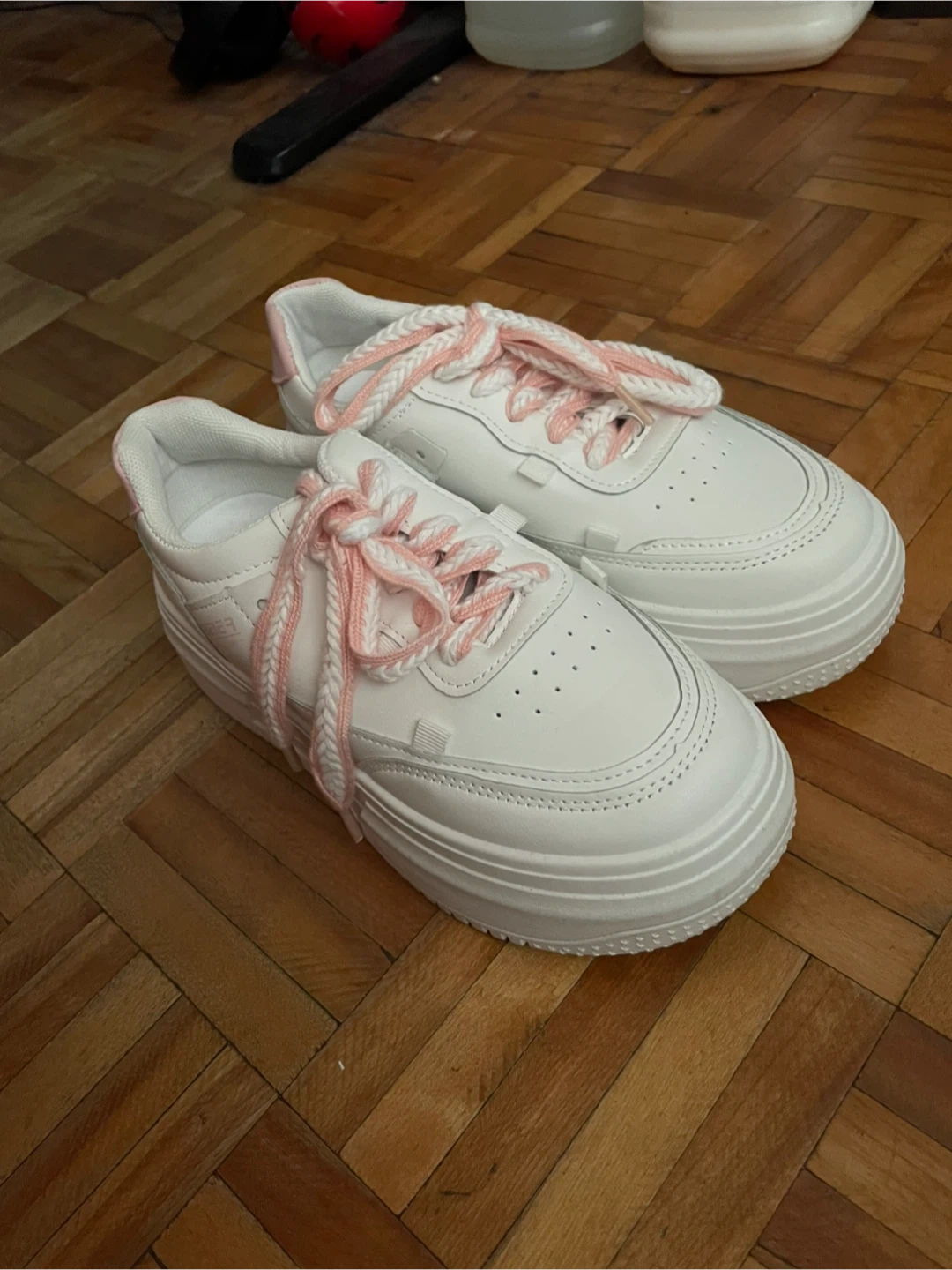 These platform sneakers are in great condition and ready for a new home! They feature a stylish white design with subtle pink accents on the laces and heel.