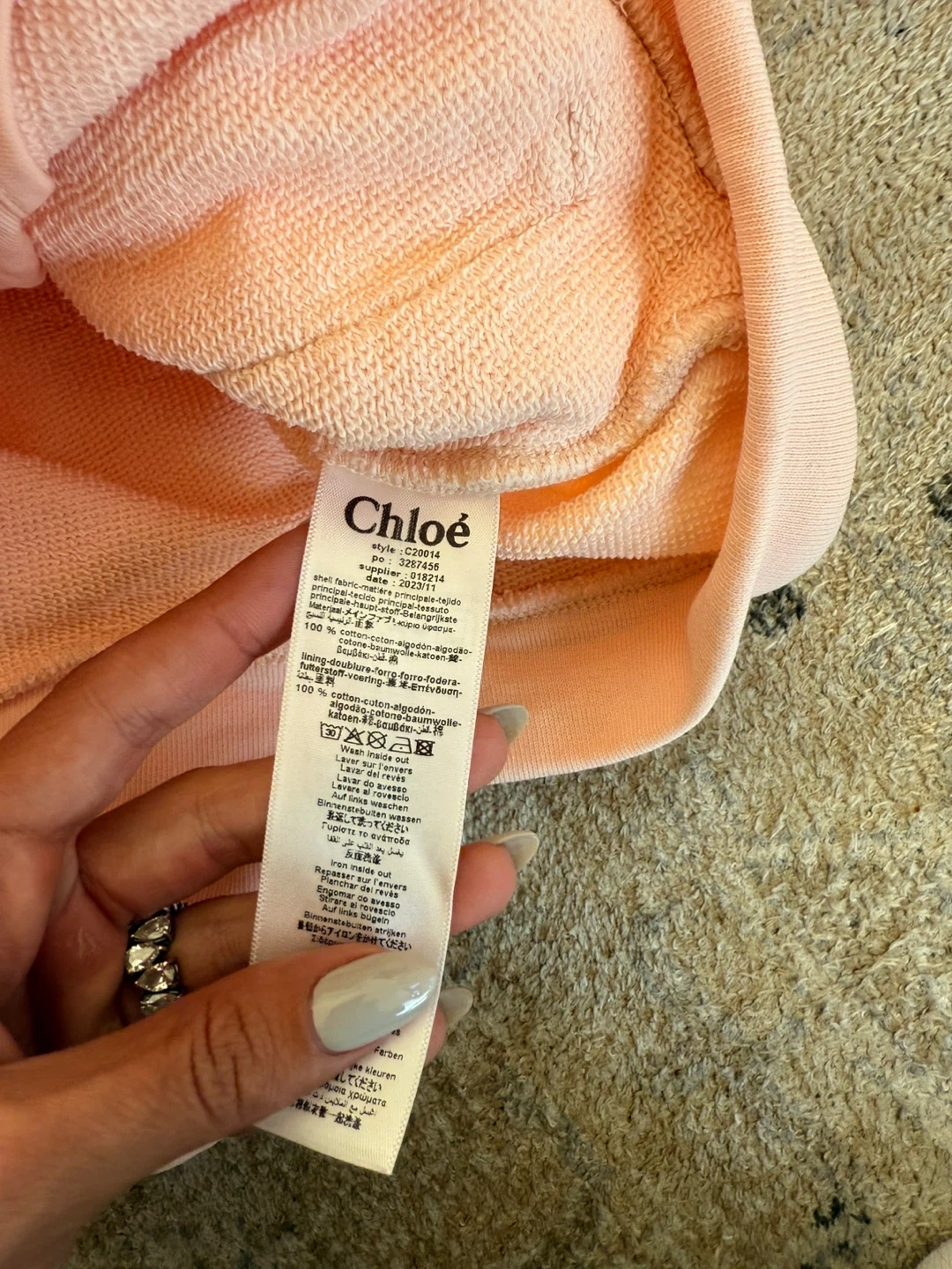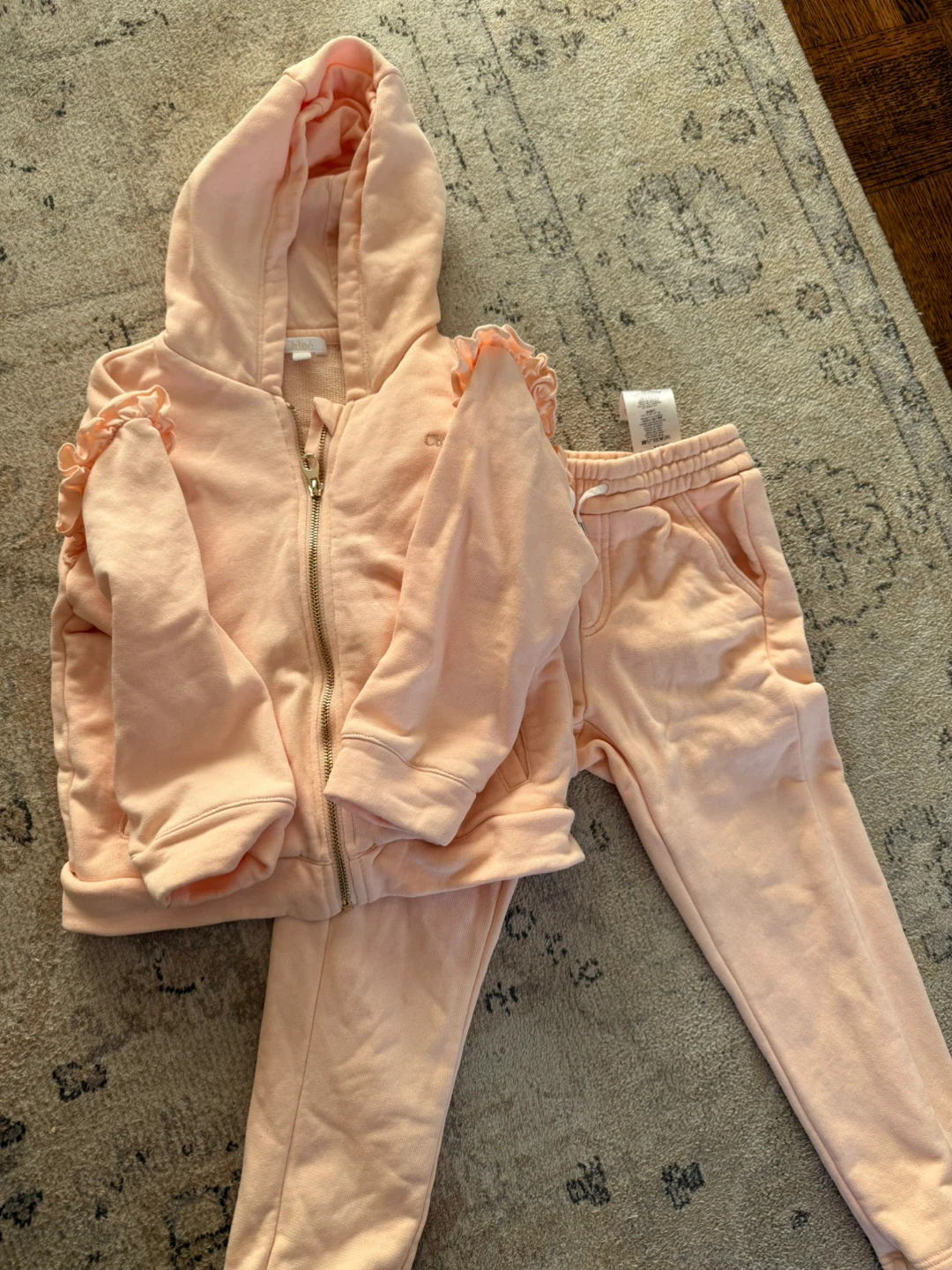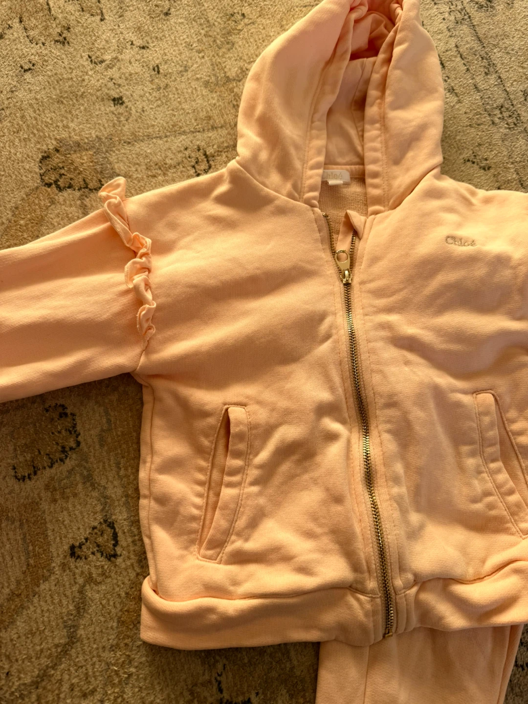 A cute Chloé kids' tracksuit in a lovely pink cotton blend! It's in great condition and perfect for keeping your little one comfy and stylish. The set includes a zip-up hoodie and matching pants.