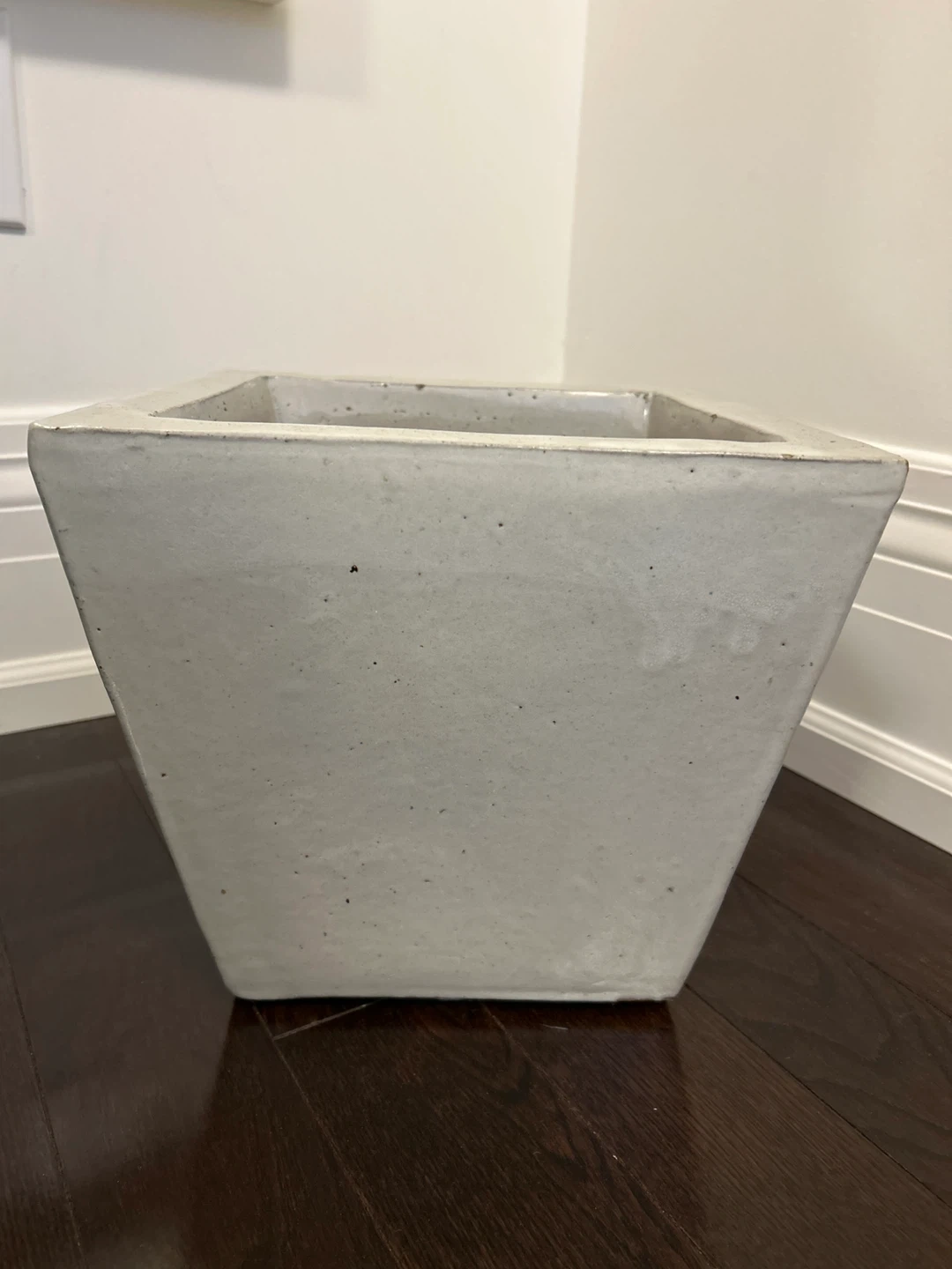 Selling a square white ceramic planter. It's a great piece for adding some greenery to your space. The planter has a nice, neutral colour that will fit in with any decor.