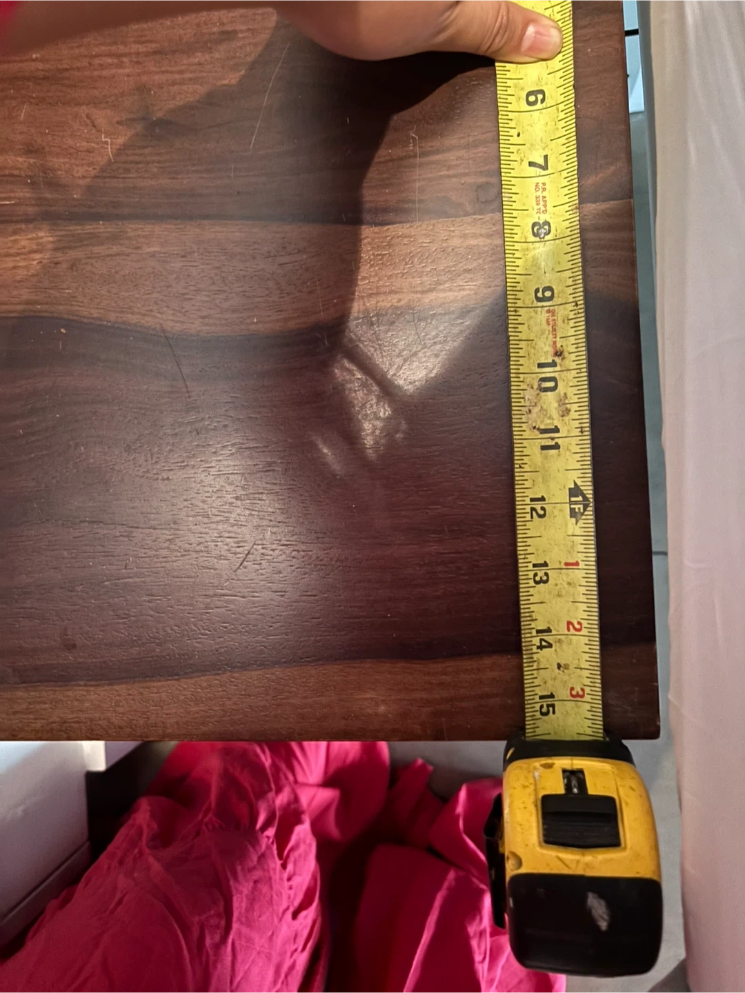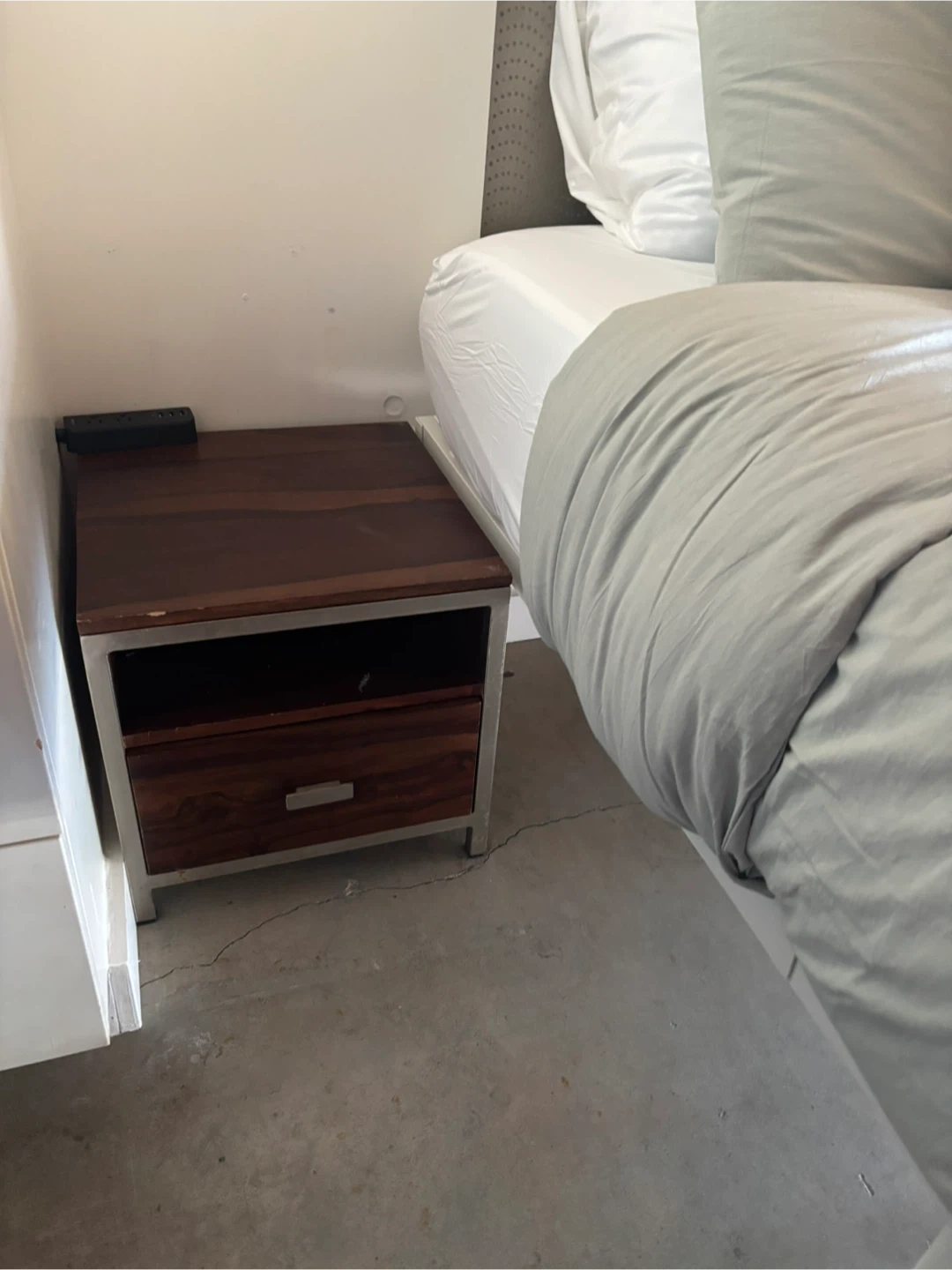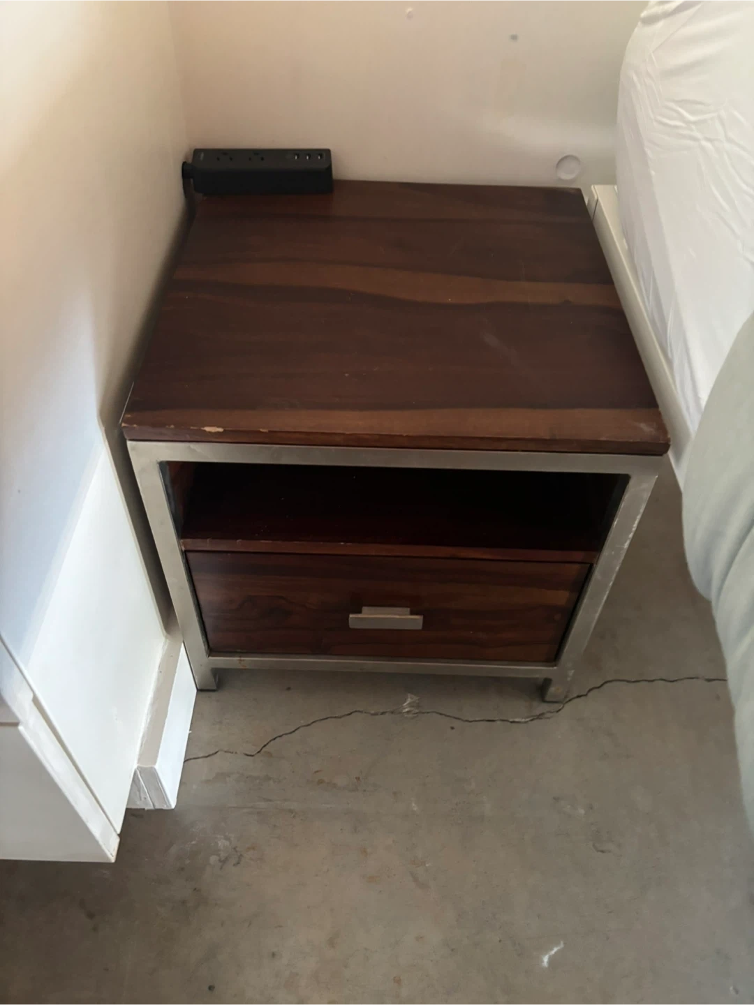 A cute set of two little nightstands with a drawer for extra storage! It's brown wood with a silver metal frame. The top is about 15.5 inches wide and 15.5 inches long x15 inches tall . Great for any bedroom!