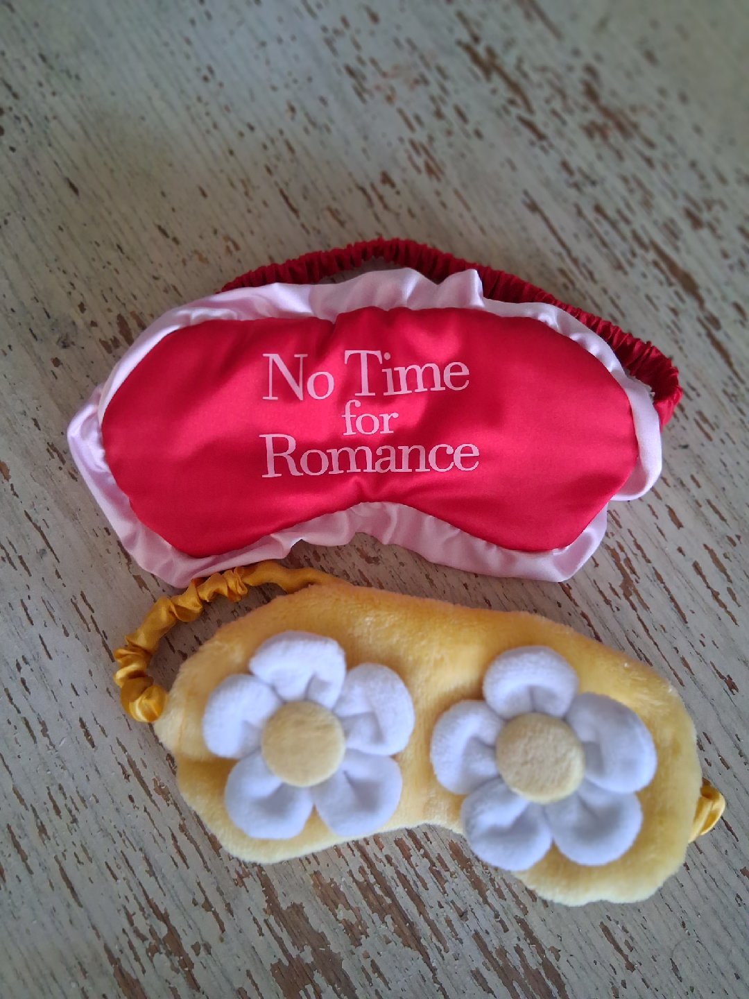 Selling a set of two sleep masks! One is red with "No Time for Romance" embroidered on it, and the other is yellow with cute flower details. Both are in great condition and ready to help you get a good night's sleep. Never used. More of a joke for my Husband.