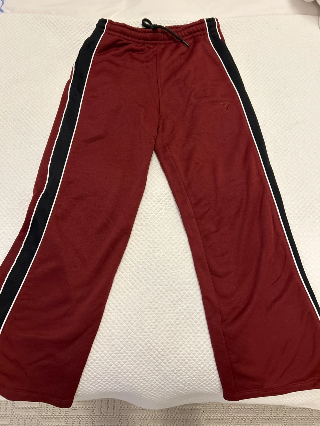 246These 7 Days Active track pants are in great condition and ready for a new home! They're a stylish burgundy colour with black and white stripes down the sides. Made from a blend of 60% polyamide and 40% cotton, they're super comfy for lounging or hitting the gym. Elastic and drawstring waist. Side pockets. Size is S. inseam is 27”