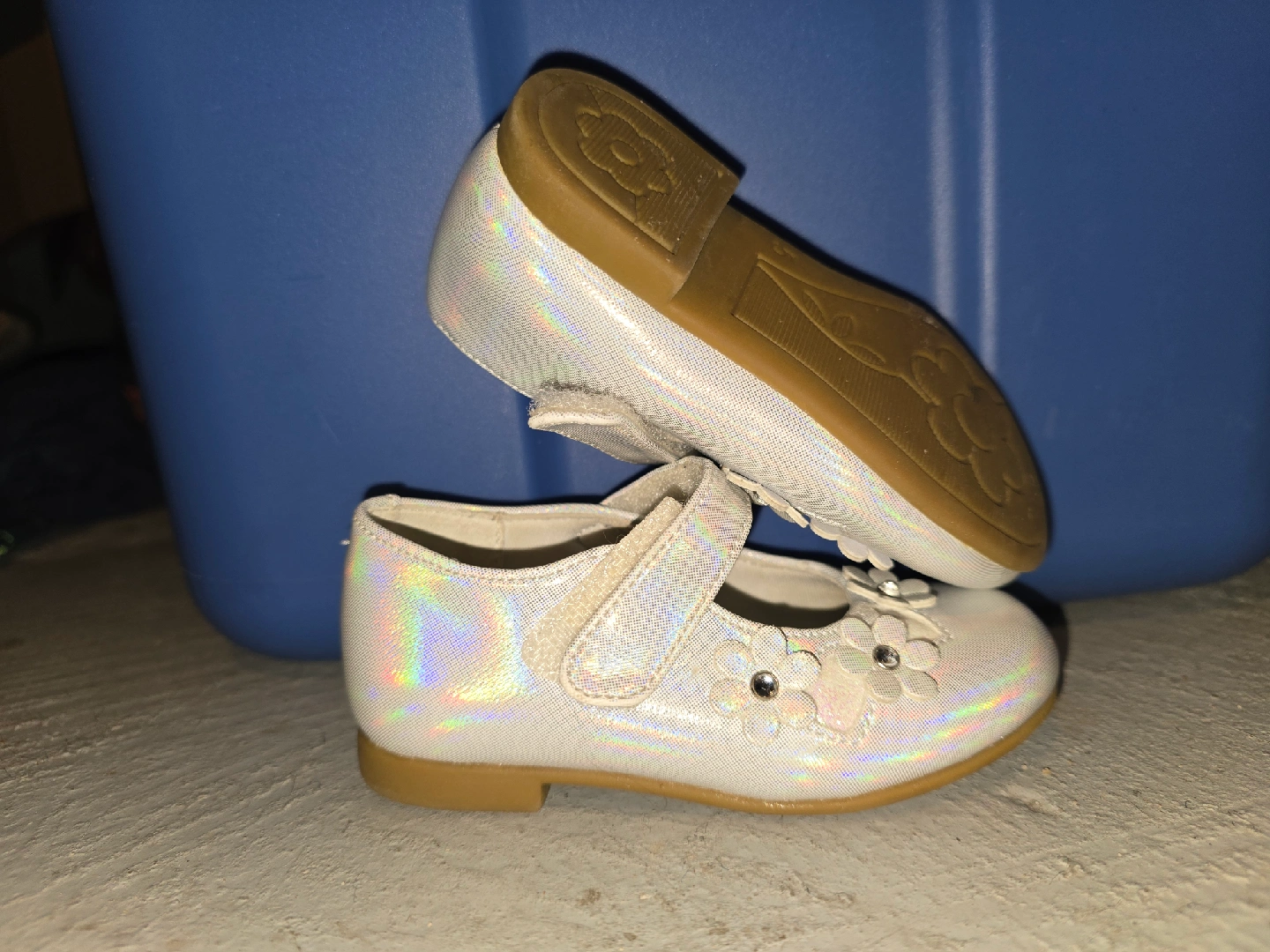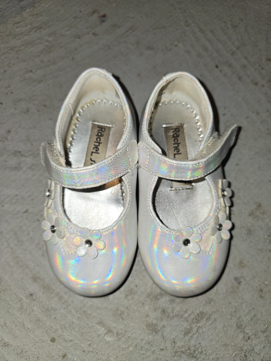 These Rachel brand shoes are perfect for your little one! They're a sparkly white colour and in a girls size 5. They feature a cute flower design, perfect for any special occasion
