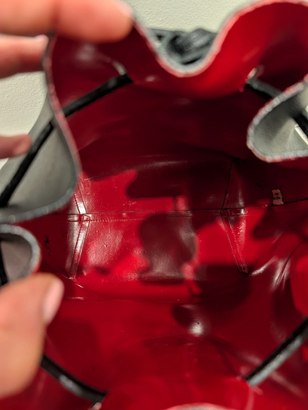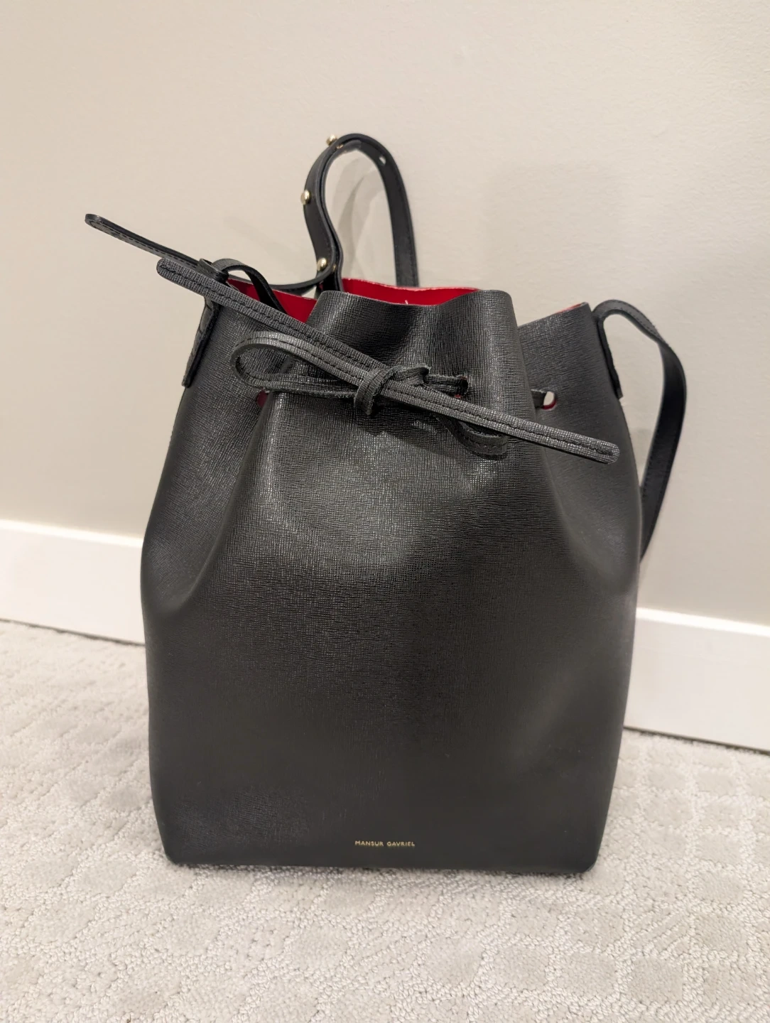 Fits a lot of things. Please see photos. Some pen stains inside and peeling a bit at top of bag near the edge. None of these things affect the function. This bag is an iconic piece that goes with everything.