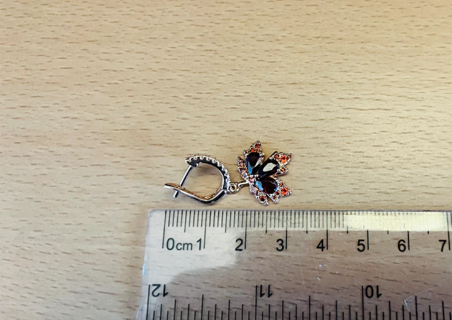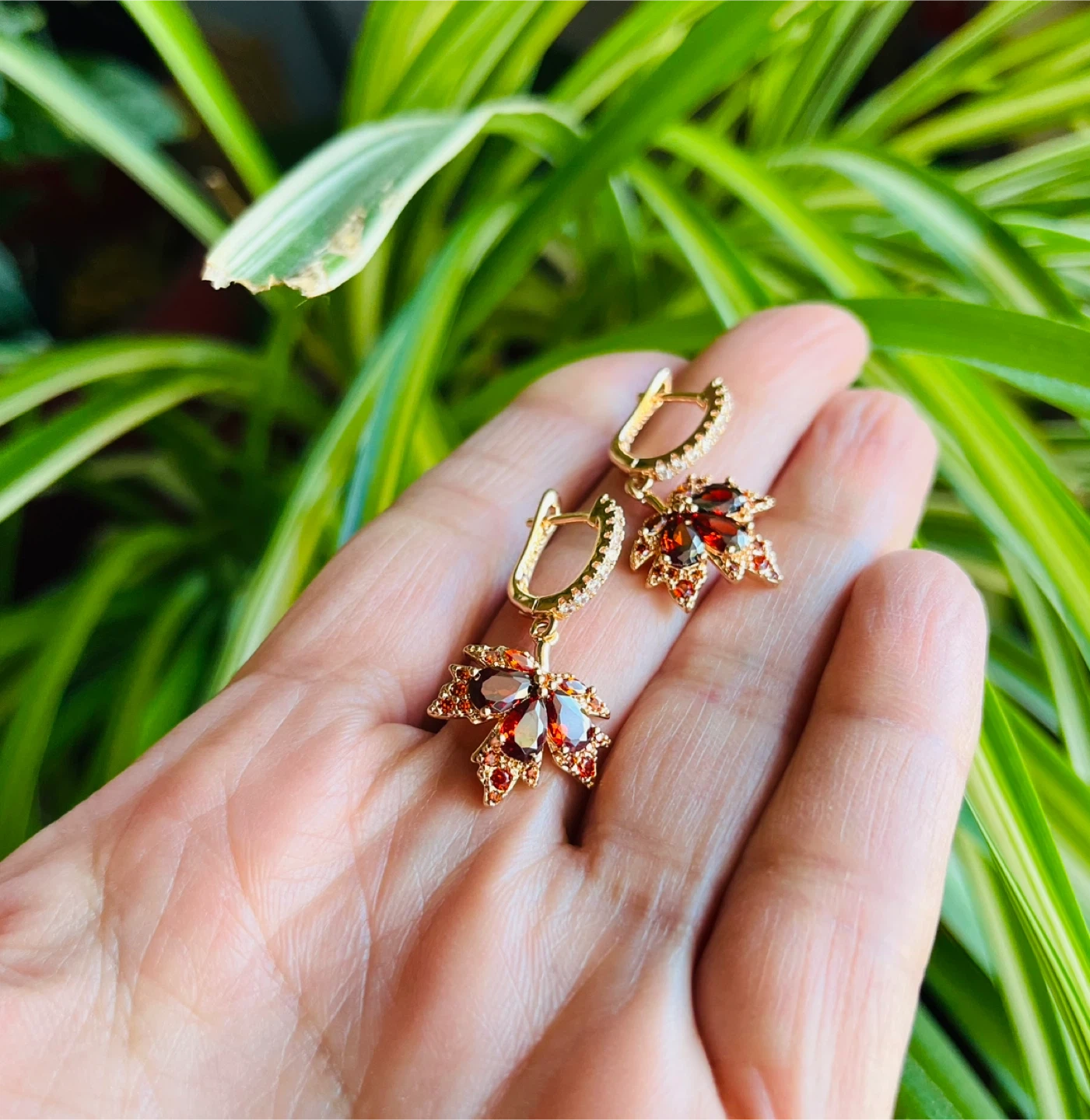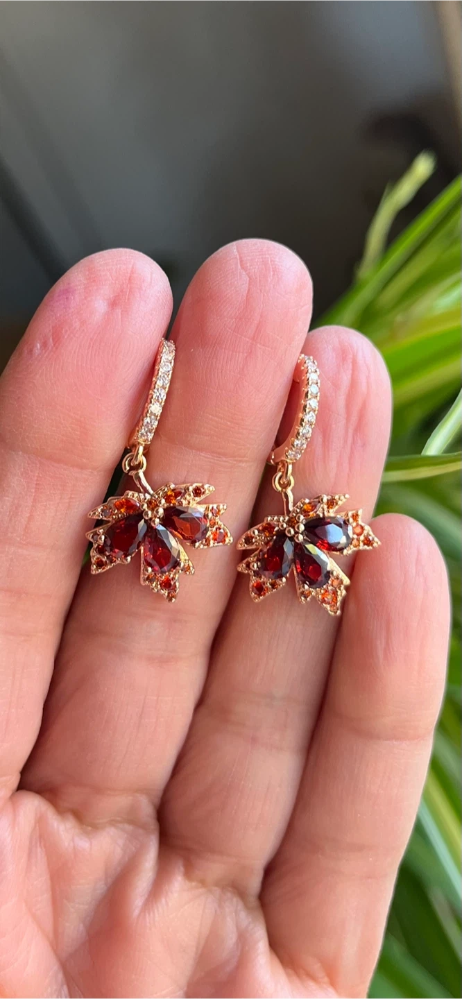 These are a pair of maple leaf dangle earrings. They feature a rose gold plated metal and reddish zircons