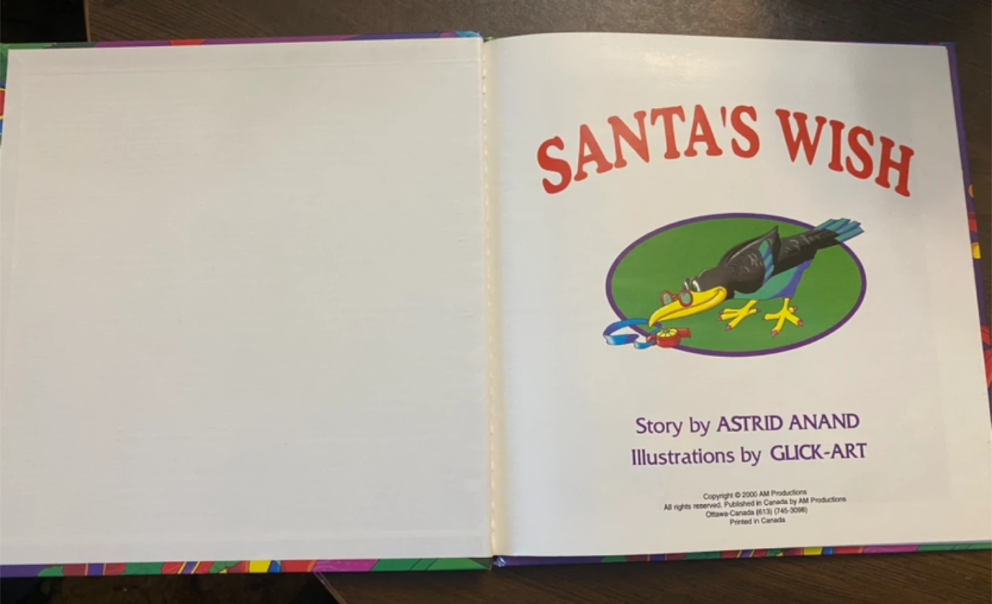 I'm selling a copy of "Santa's Wish" by Astrid Anand. It's a charming children's book with illustrations by Glick-Art. It was printed in Canada by AA Productions. A sweet story for the holiday season!