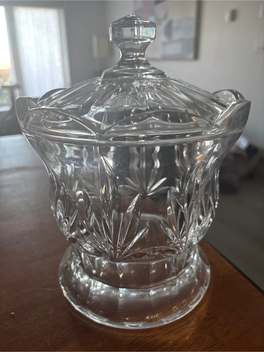 Selling a beautiful crystal candy dish with a lid. It's in great condition and would look lovely on any table or counter. The intricate design catches the light beautifully, adding a touch of elegance to your home