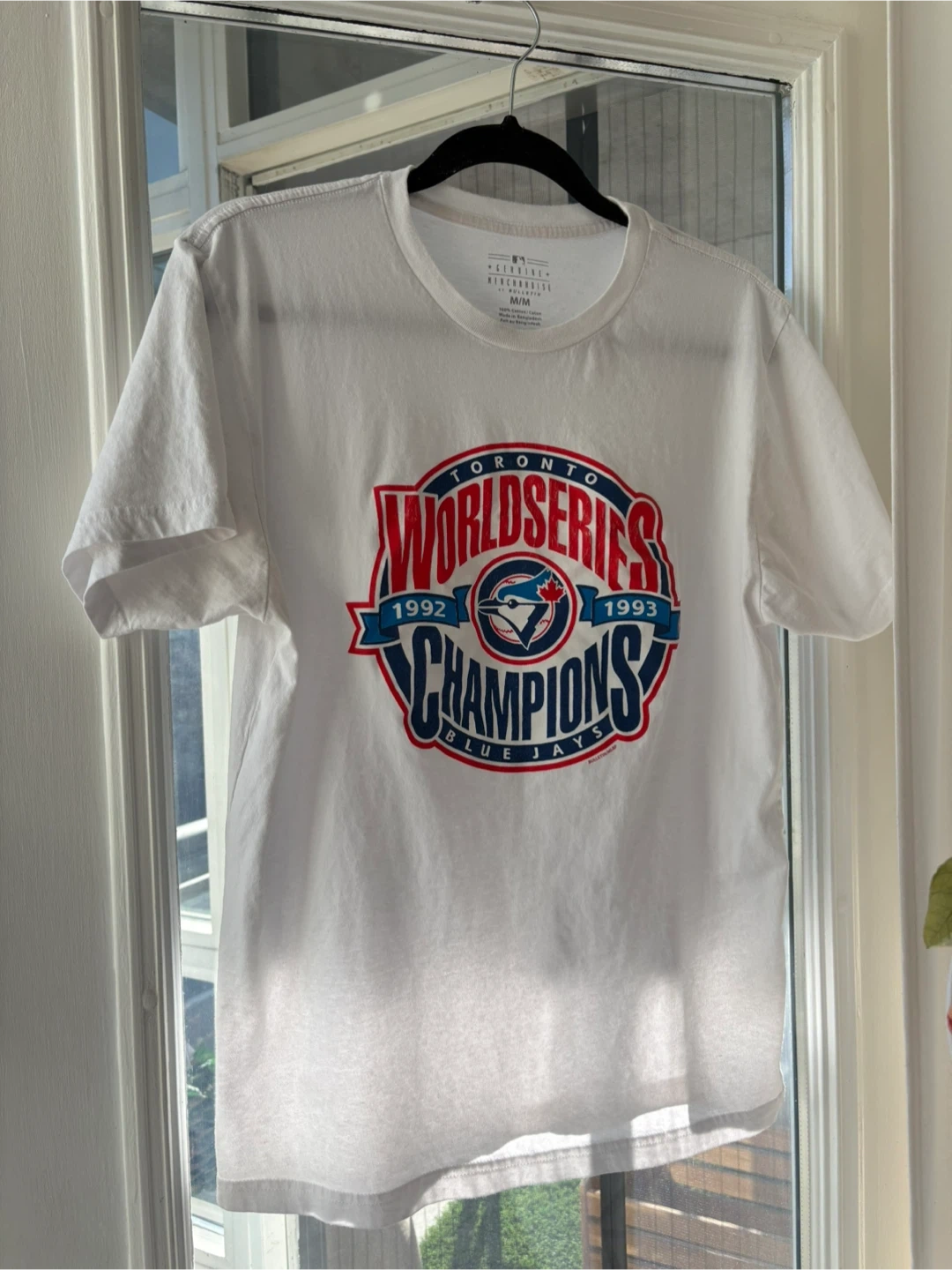 Show your support for the Toronto Blue Jays with this World Series Champions t-shirt! It commemorates their victories in 1992 and 1993. The shirt is a size medium and features a bold graphic design. Perfect for any Blue Jays fan!