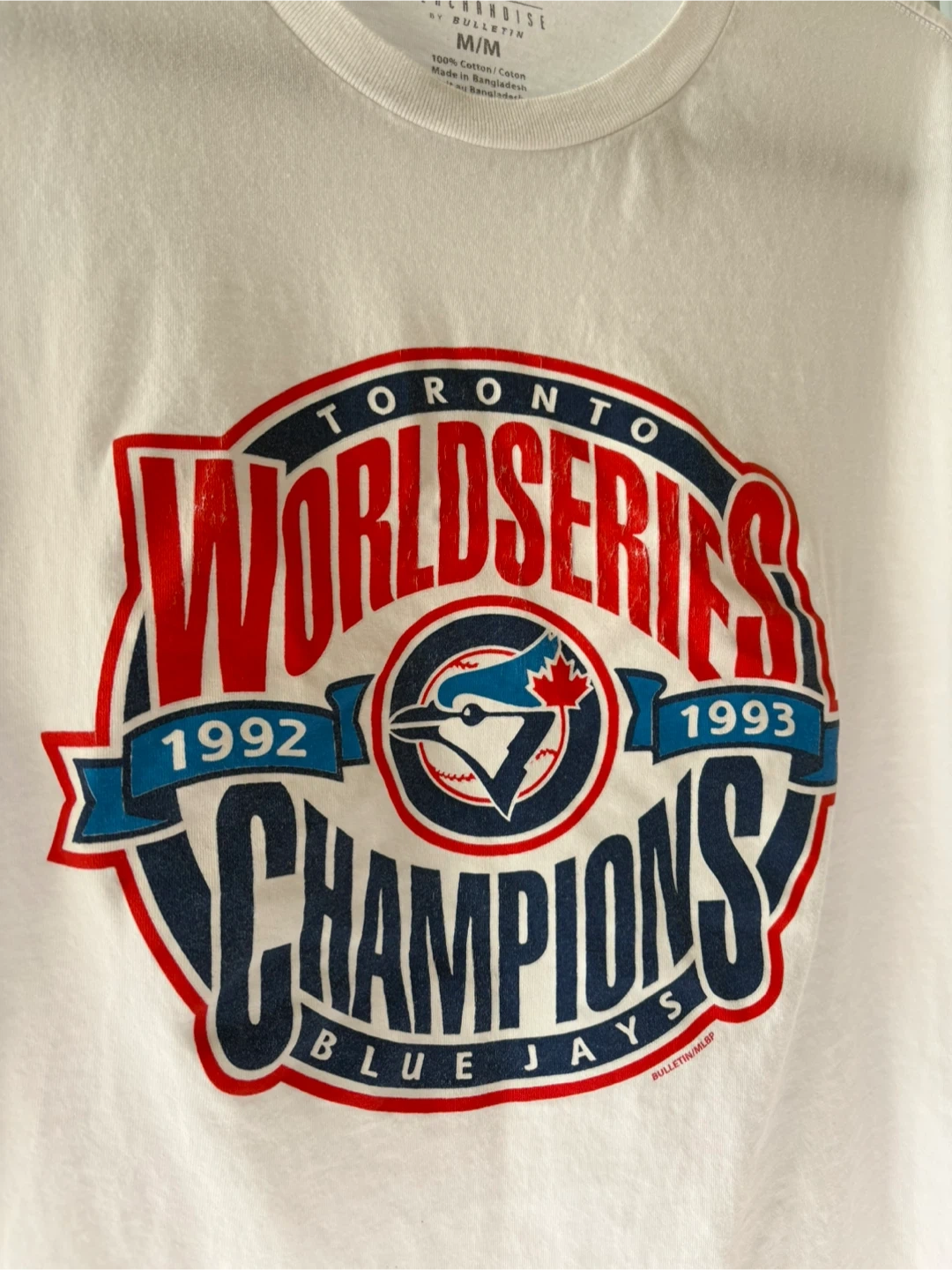 693Show your support for the Toronto Blue Jays with this World Series Champions t-shirt! It commemorates their victories in 1992 and 1993. The shirt is a size medium and features a bold graphic design. Perfect for any Blue Jays fan! Please feel free to take a look at my other listings to make bundles for a better deal! Most items are $10 or less! All sales final Serious inquiries only please Pick up only - downtown near Richmond/George