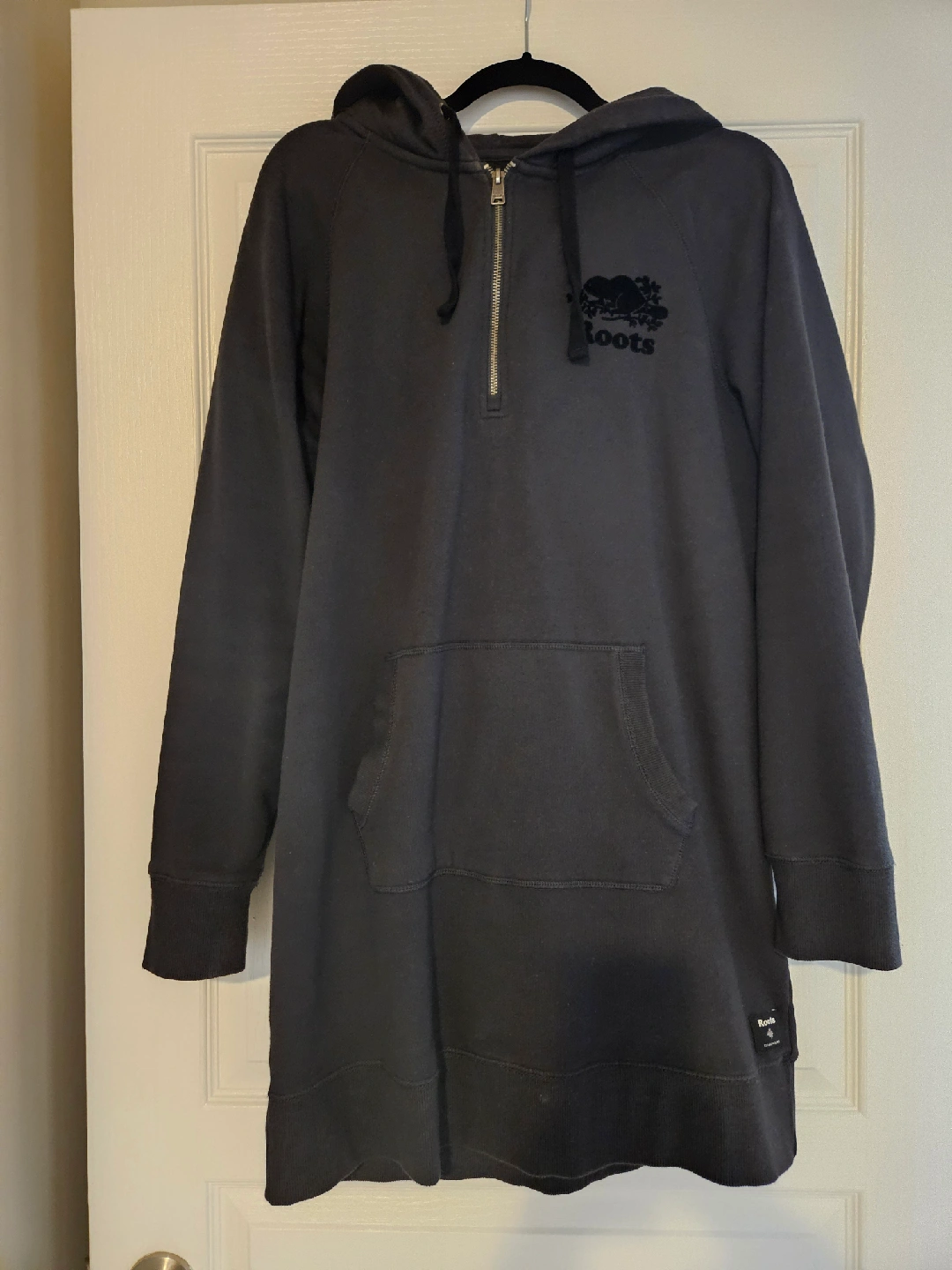 Cozy up in this Roots half-zip hoodie dress! It's a comfy and stylish piece, perfect for casual days. The dress is made of 80% cotton and 20% polyester, so it's soft and easy to care for. Size is M/M.