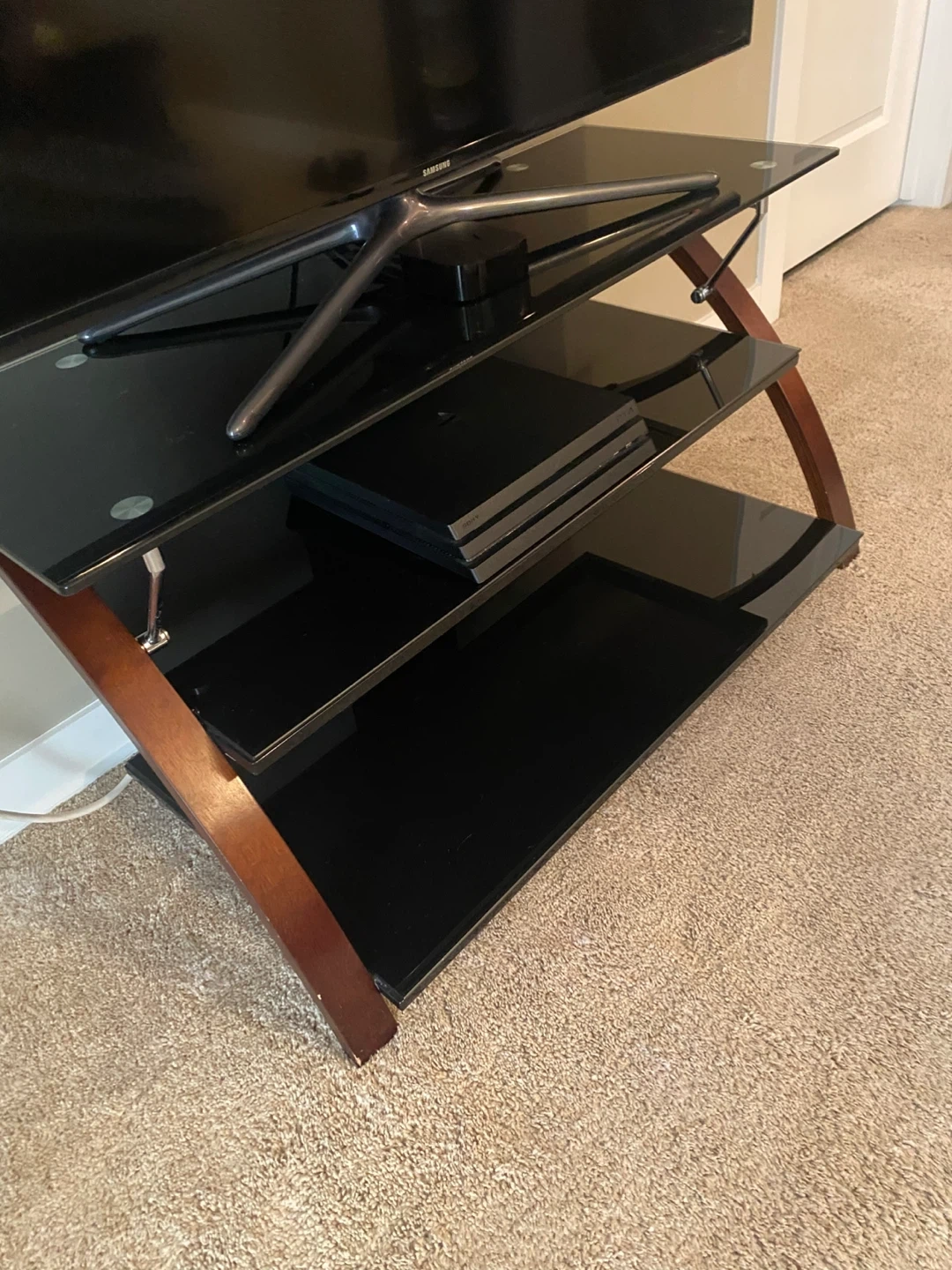 Selling a glass TV stand with a wooden frame. It's in great shape and ready for a new home! It features multiple shelves for your media devices and accessories