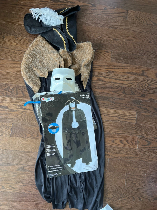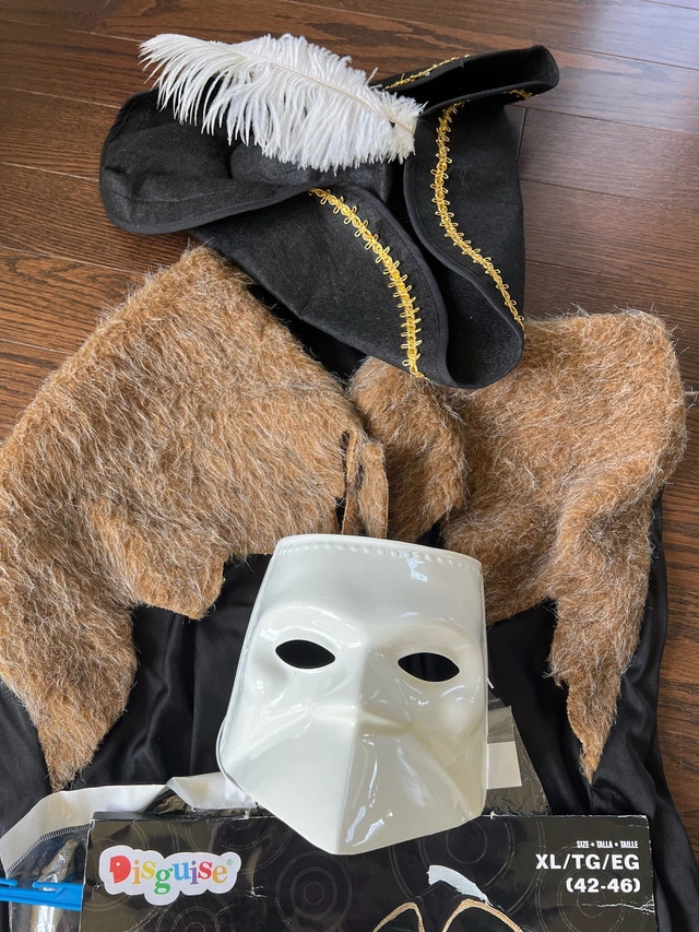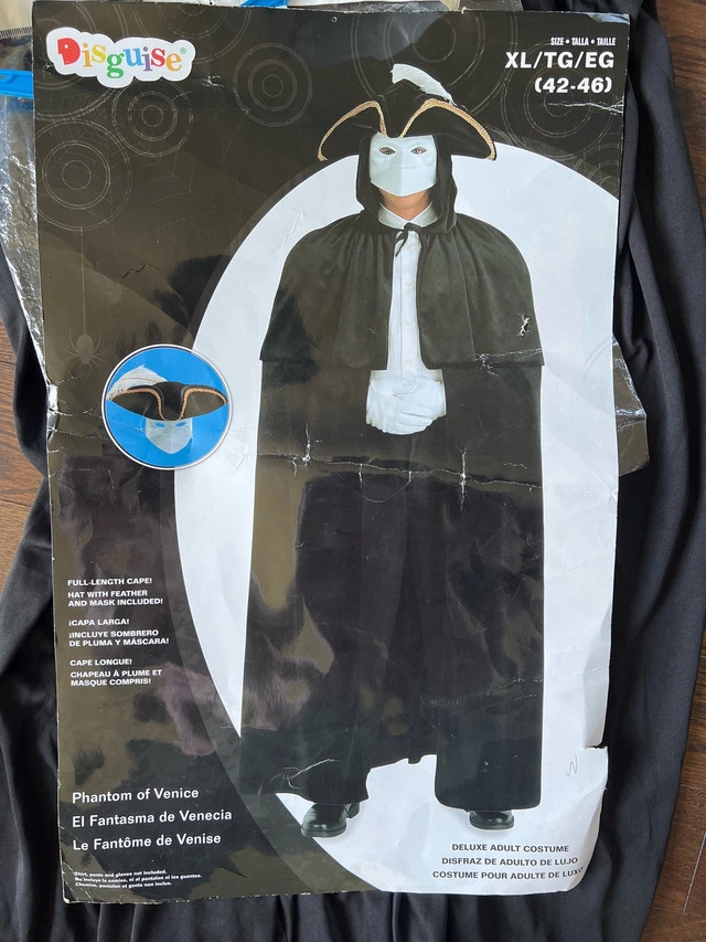 20Get ready for Halloween with this Disguise Phantom of Venice costume! This deluxe adult costume, size XL (42-46), includes a full-length cape, hat with feather, and mask. It's in excellent condition, ready to make a spooky statement. If the ad is up, the Phantom is available to haunt your Halloween.