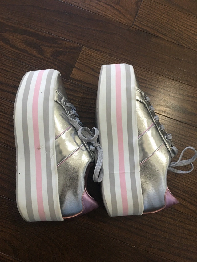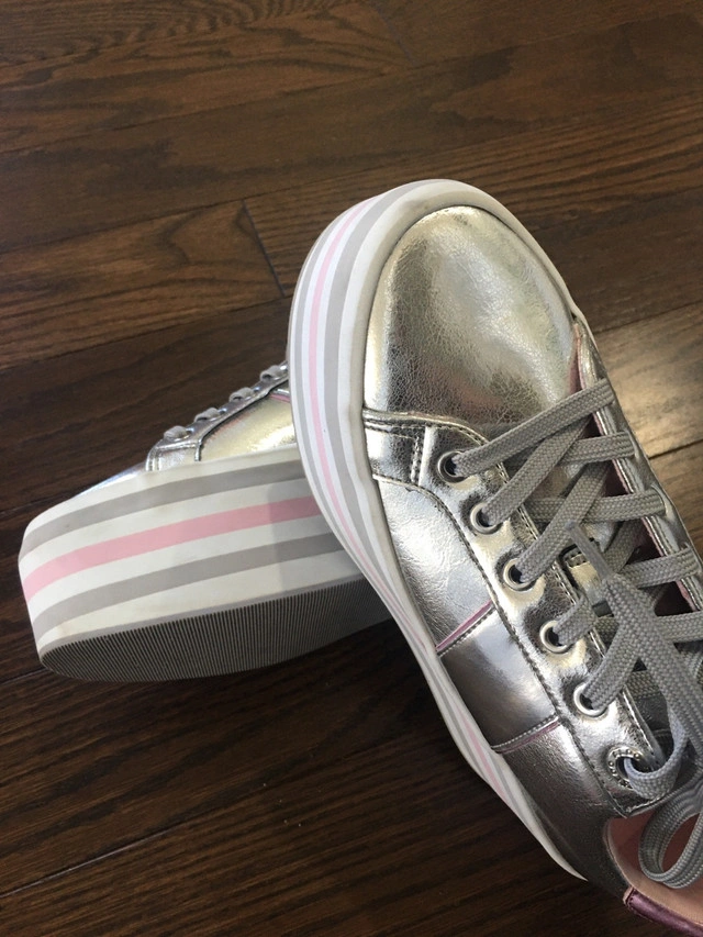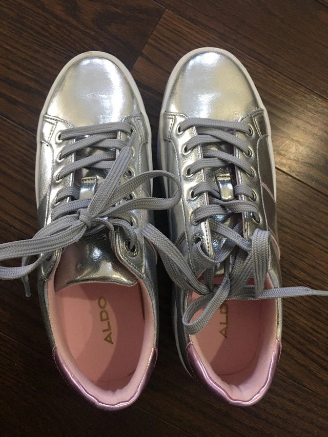 20Shine on with these size 7 Aldo silver metallic platform sneakers! These head-turning kicks feature a sporty silhouette with a dazzling silver finish and a trendy platform sole. These sneakers are in good used condition, ready to add a touch of glam to your everyday style. * Brand: Aldo * Size: 7 * Colour: Silver * Style: Platform Sneakers Ready to strut in style? If the ad is still up, you bet these shiny steppers are still available!