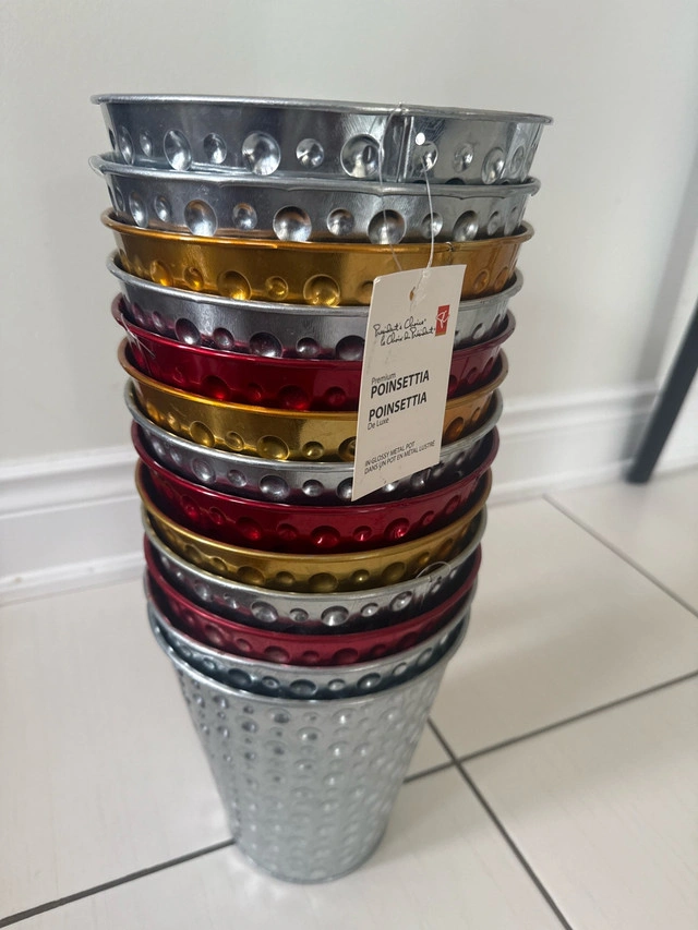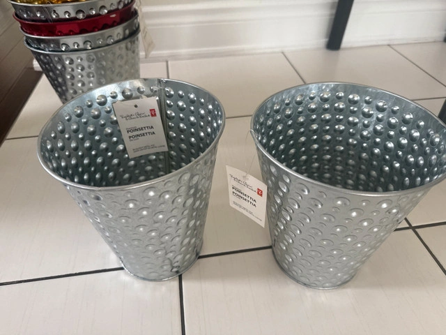 20Add a touch of rustic charm to your holiday decor with this set of Pottery Barn Poinsettia buckets. These decorative buckets come in silver, red, and gold and are the perfect size for small plants or festive displays. They are in new condition. Key Features: * Brand: Pottery Barn * Type: Poinsettia Buckets * Colours: Silver, Red, Gold * Condition: New $5 each