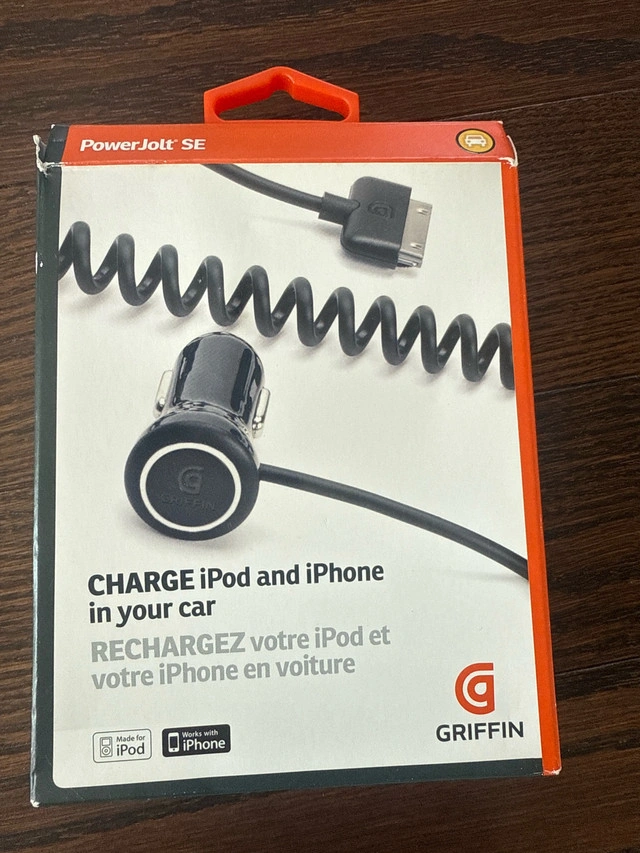 20This Griffin PowerJolt SE car charger is designed to charge your iPod and iPhone in your car, featuring a low-profile design with a status light. It is compatible with older Apple devices that use a dock connector. * Designed for older iPod and iPhone models with dock connector * Low-profile design with status light * Charges via car's power outlet In a world where car chargers are a dime a dozen, the Griffin PowerJolt SE stands out for its compatibility with older devices. It's like a blast from the past, ready to juice up your vintage tech! And remember, if the ad's still up, it's still available!