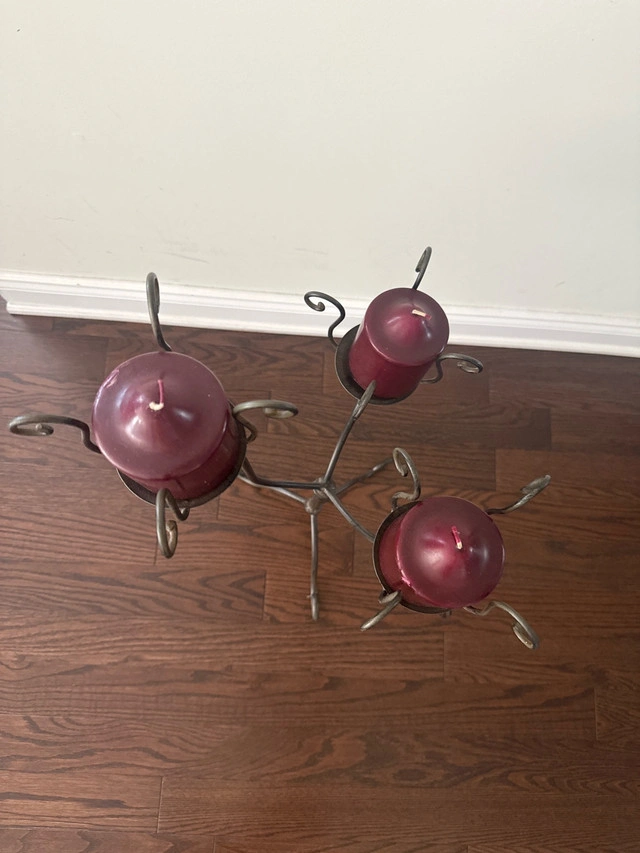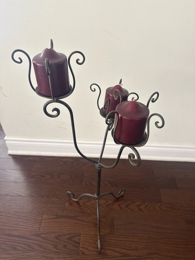 20Enhance your home decor with this used, elegant metal candle holder, perfect for adding a touch of sophistication to any room. Featuring a sturdy base and three arms to hold your favourite candles, this piece is sure to create a warm and inviting atmosphere. It's in good condition and ready to illuminate your space! * Sturdy metal construction * Three-candle design * Elegant, decorative style. And just a friendly note: if the ad is up, it's still available!