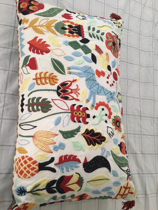 20This vibrant decorative pillow features colourful embroidery and tassel detailing, perfect for adding a bohemian touch to any room. It is in good, used condition. If the ad is still up, it's available!