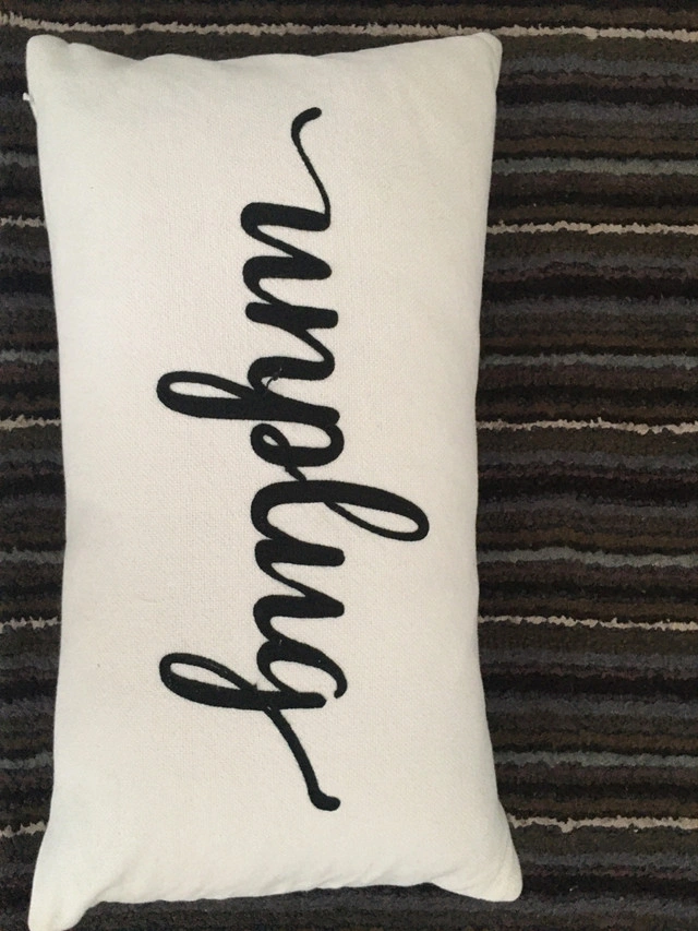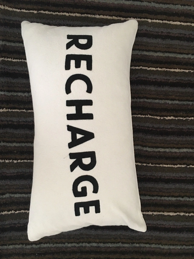 20Add a touch of inspiration to your space with this 'Recharge' decorative pillow! Measuring 12x24 inches, this pillow is in used-good condition and features the word 'Recharge' embroidered on one side and 'unplug' on the other. It's a great reminder to take a break and relax. This pillow seems to whisper, 'Go on, take a nap, you deserve it!' If you see this ad, it's still available! For Sale By: Owner