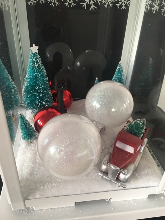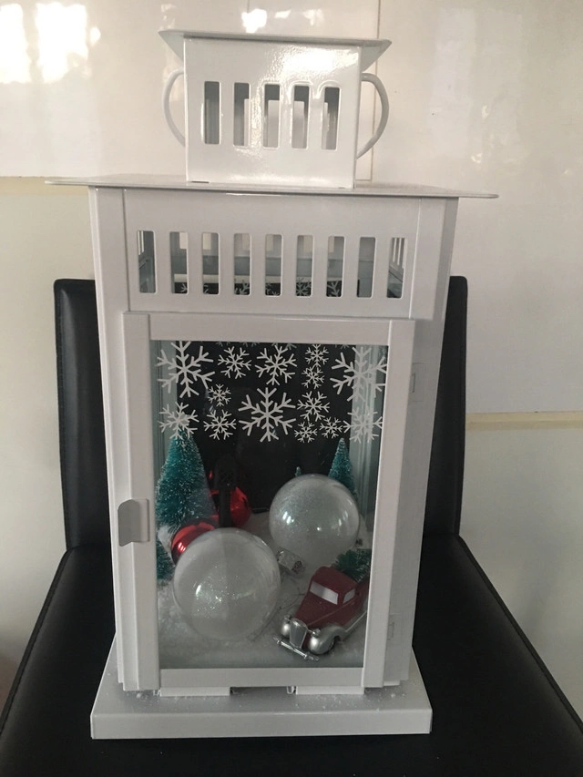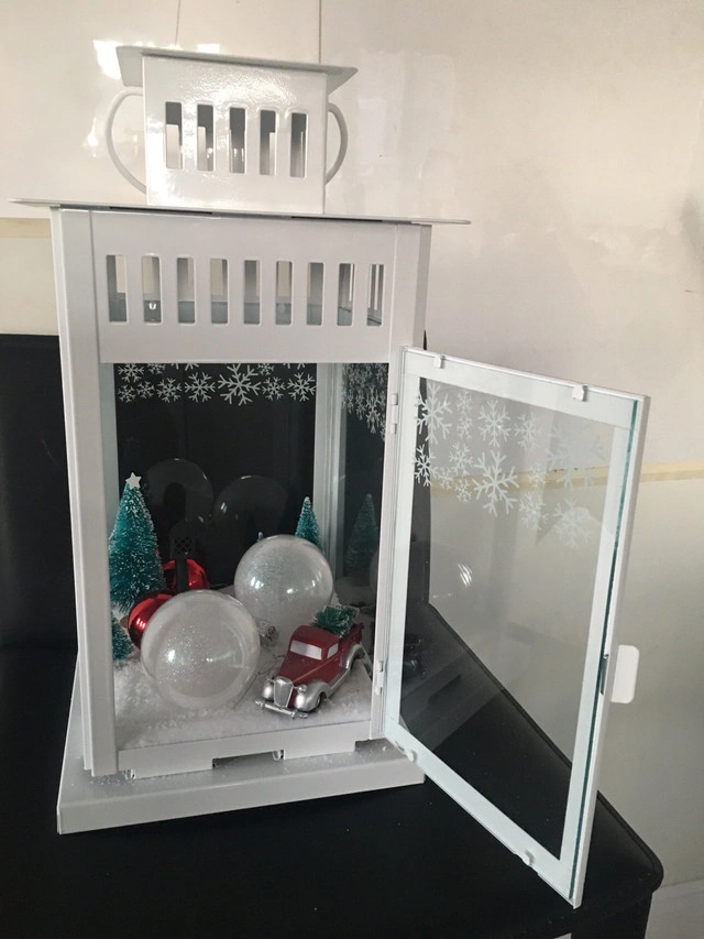 20Add a festive touch to your home with this charming Christmas lantern, complete with decorative snow, miniature trees, and a classic red truck, creating a cozy holiday scene. The lantern is ready to light up your holiday decor.