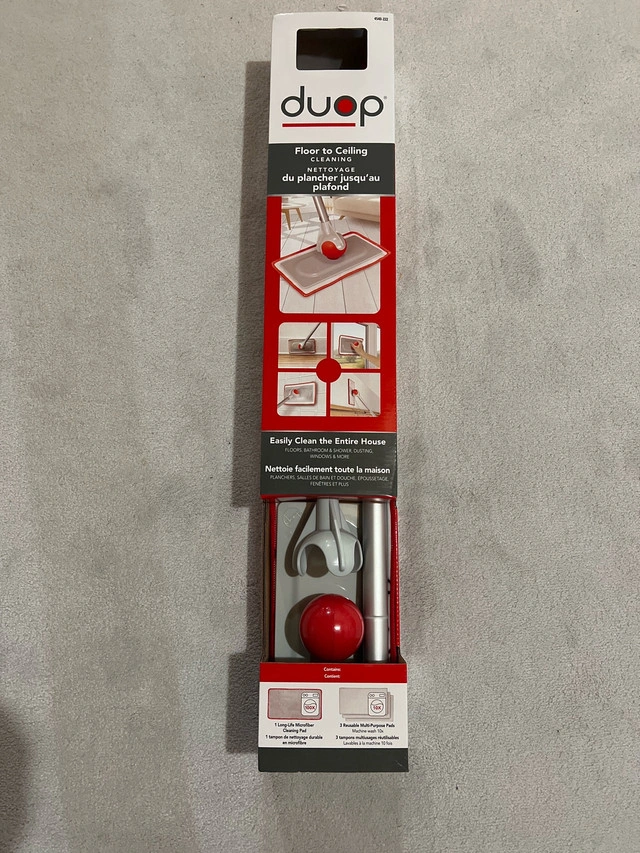 20This Duop Floor to Ceiling Cleaning System is brand new in its original packaging and includes everything needed for versatile cleaning around the home. * Features the Quickball multi-directional system * Deep cleaning, multi-purpose pads * Long-life microfiber cleaning pads * Reusable multi-purpose pads
