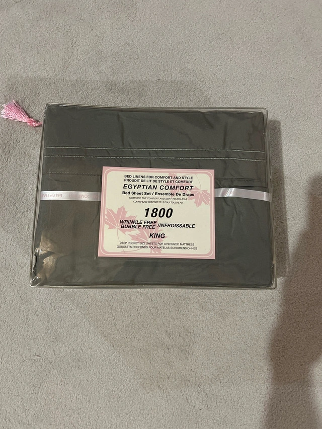 20Get ready for a great night's sleep with this new Egyptian Comfort 1800 thread count King Sheet Set in grey. The set includes a flat sheet, fitted sheet, and two pillowcases. These sheets are wrinkle-free and have a bubble-free finish for easy care and a smooth feel. The fitted sheet fits up to an 18-inch mattress. Specifications: * Size: King * Colour: Grey * Thread Count: 1800 * Wrinkle-free * Bubble-free finish * Fitted sheet fits up to 18" mattress If the ad is still up, yes, it's available. Happy dreams!