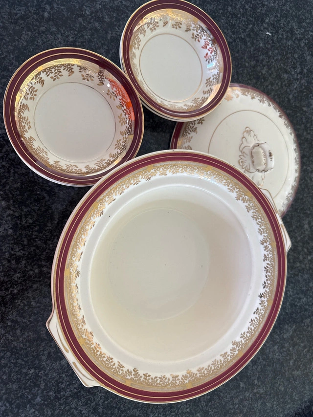 20This is a set of Royal Albert serving dishes, perfect for adding a touch of elegance to your dining experience! The set includes a large serving bowl with a lid, as well as four smaller bowls. The pieces feature a maroon and gold floral design. This set is used but in great condition, ready to adorn your table for many meals to come. Serving bowl with lid and 5 plates - see pictures. 2 small chips