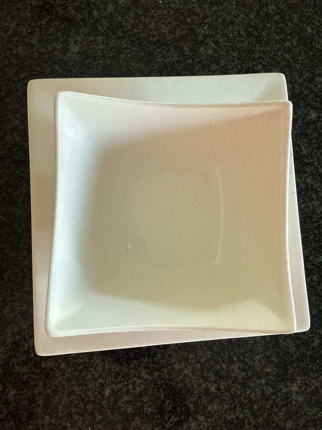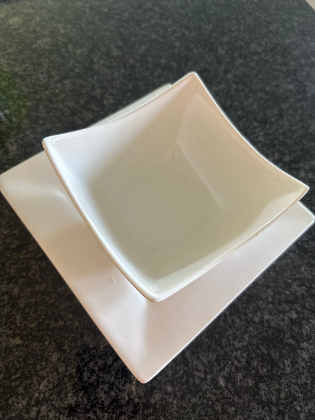 20This is a square serving set, including a small square bowl and a larger square plate beneath it. It is perfect for serving snacks or appetizers. It is in good condition. Add a touch of elegance to your table setting with this delightful square serving set! It's just waiting to be the star of your next gathering. If you're reading this, it's still available!