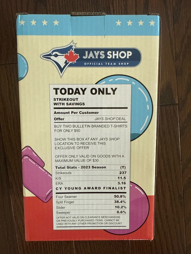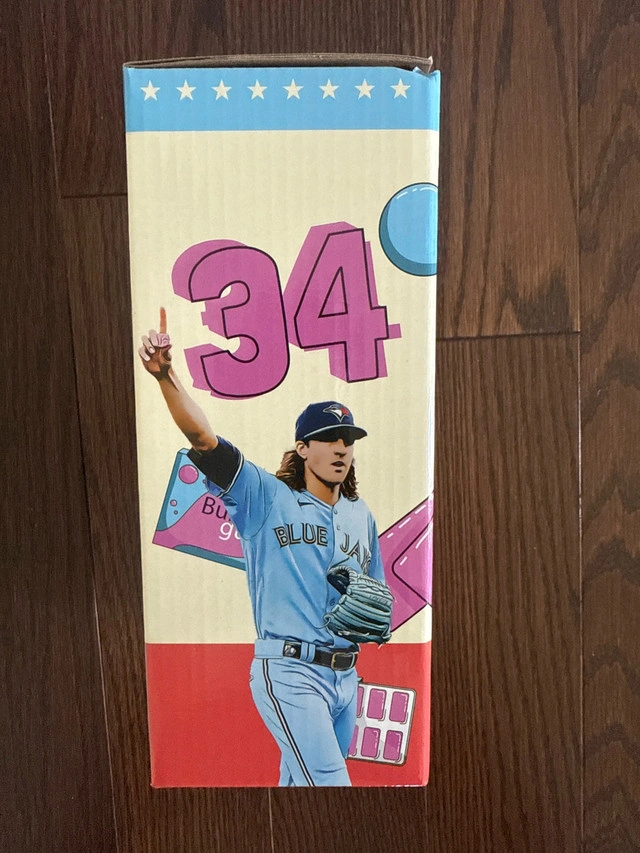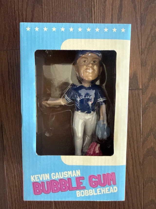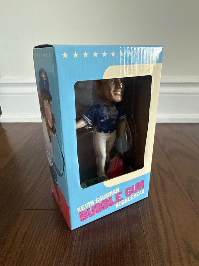 20Get your hands on this Kevin Gausman Bubble Gum Bobblehead, a must-have for any Blue Jays fan! This unique collectible captures Gausman in action, complete with his signature bubble-blowing pose. Whether you're a die-hard collector or just looking for a fun piece of memorabilia, this bobblehead is sure to be a home run. It's in excellent condition, with the original box.